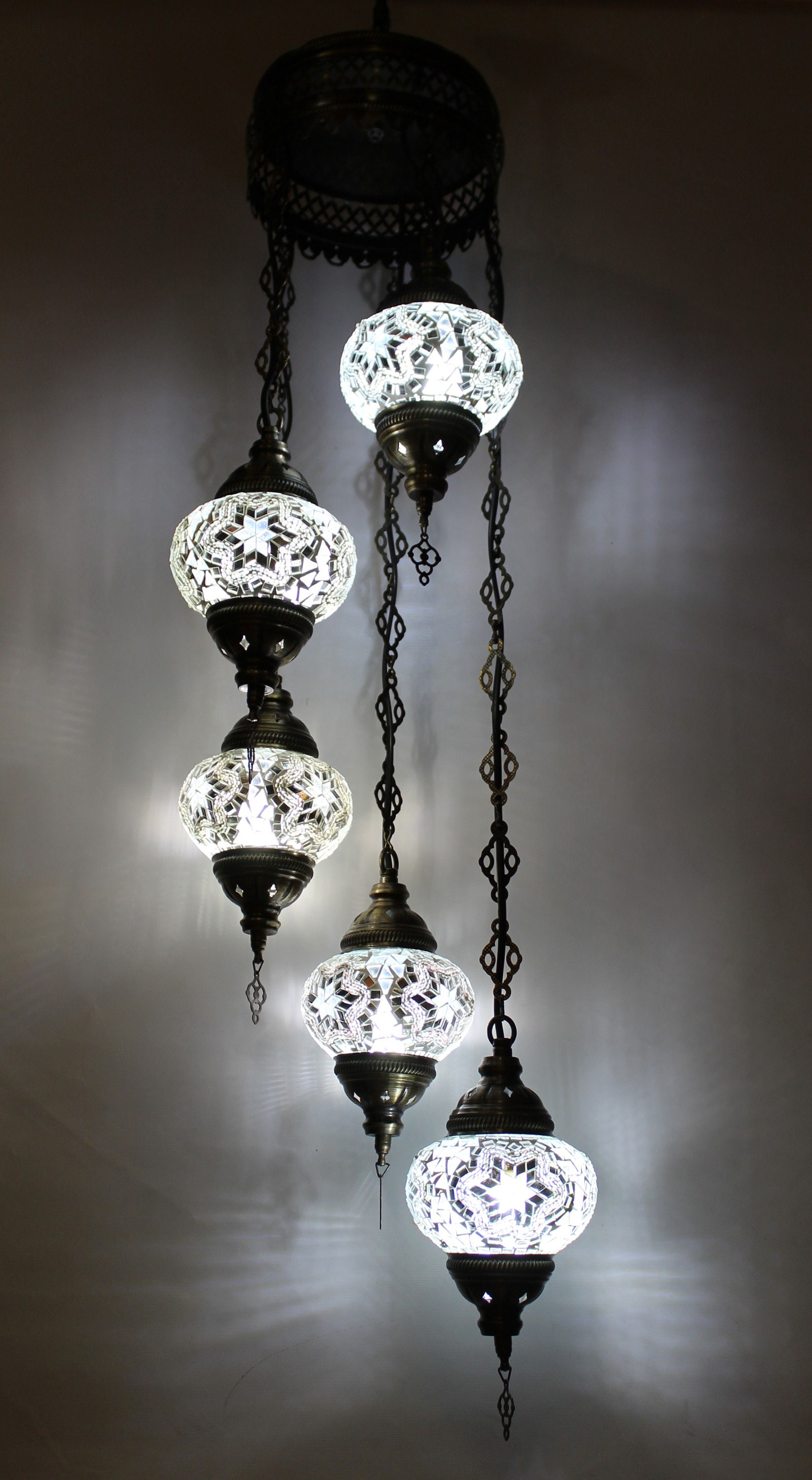 The lamp takes a regular chandelier light bulbs (E12 socket size), 5 LED light bulbs are included.