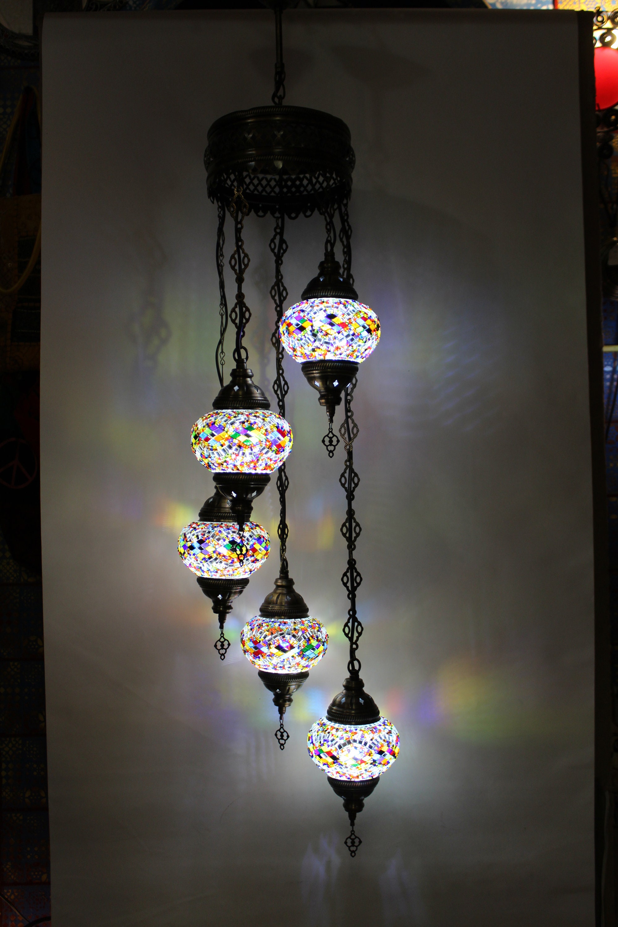 This ceiling lamp was made in Turkey using fine quality materials, like fired glass, and copper. The globe itself is entirely handmade. Small pieces of fired glass, mirrors, and beads were put together to create this mesmerizing design. The body of the lamp is copper, and was made in Turkey as well, and decorated with beautiful filigree.