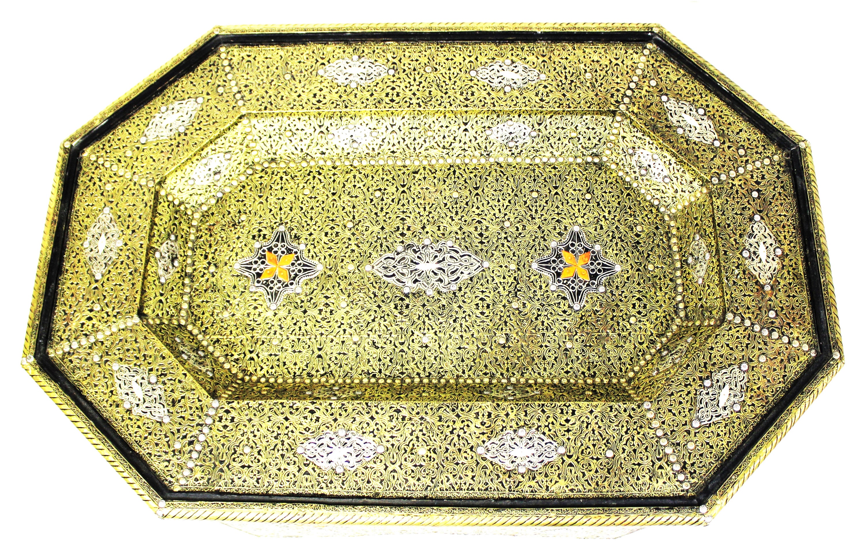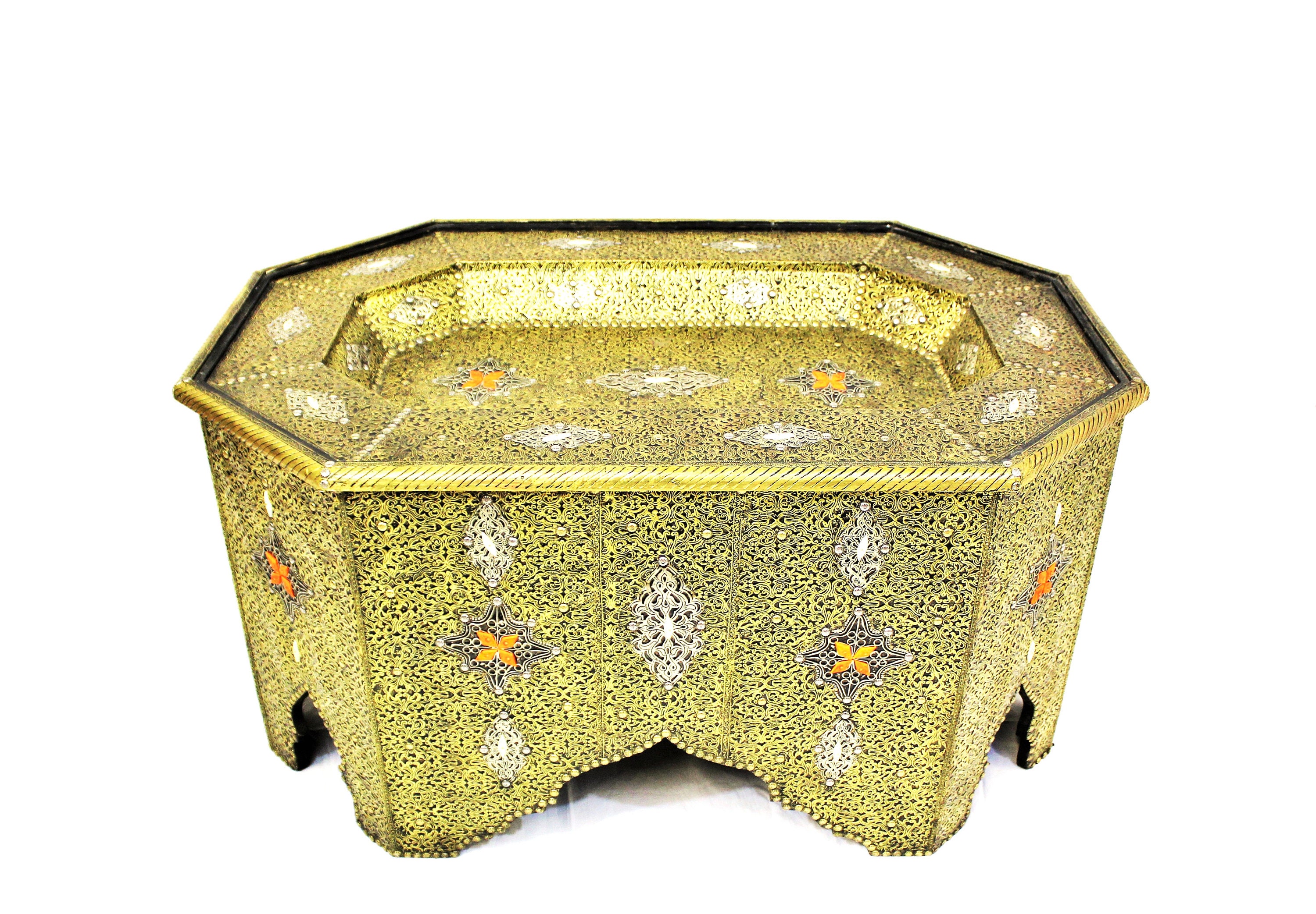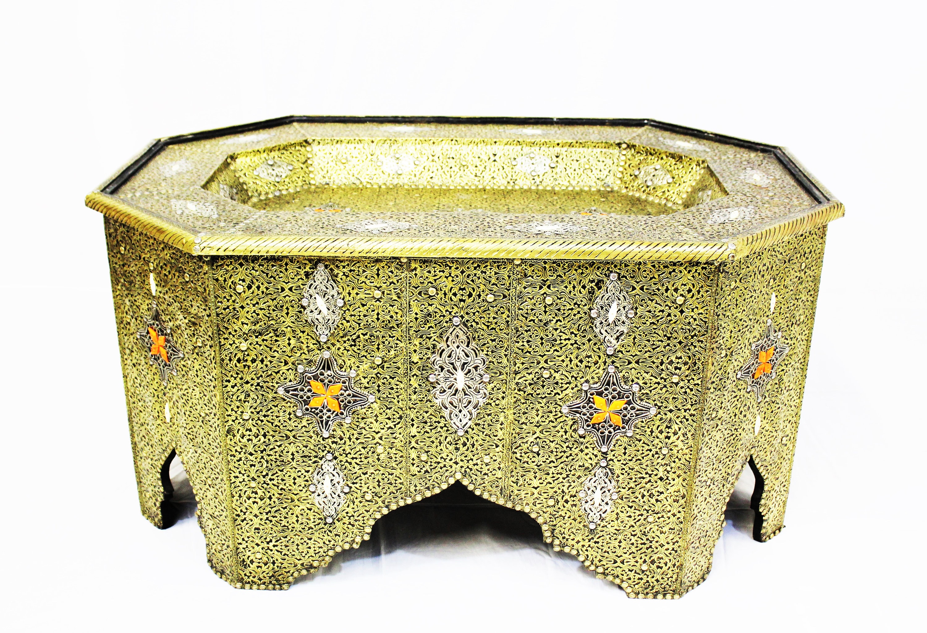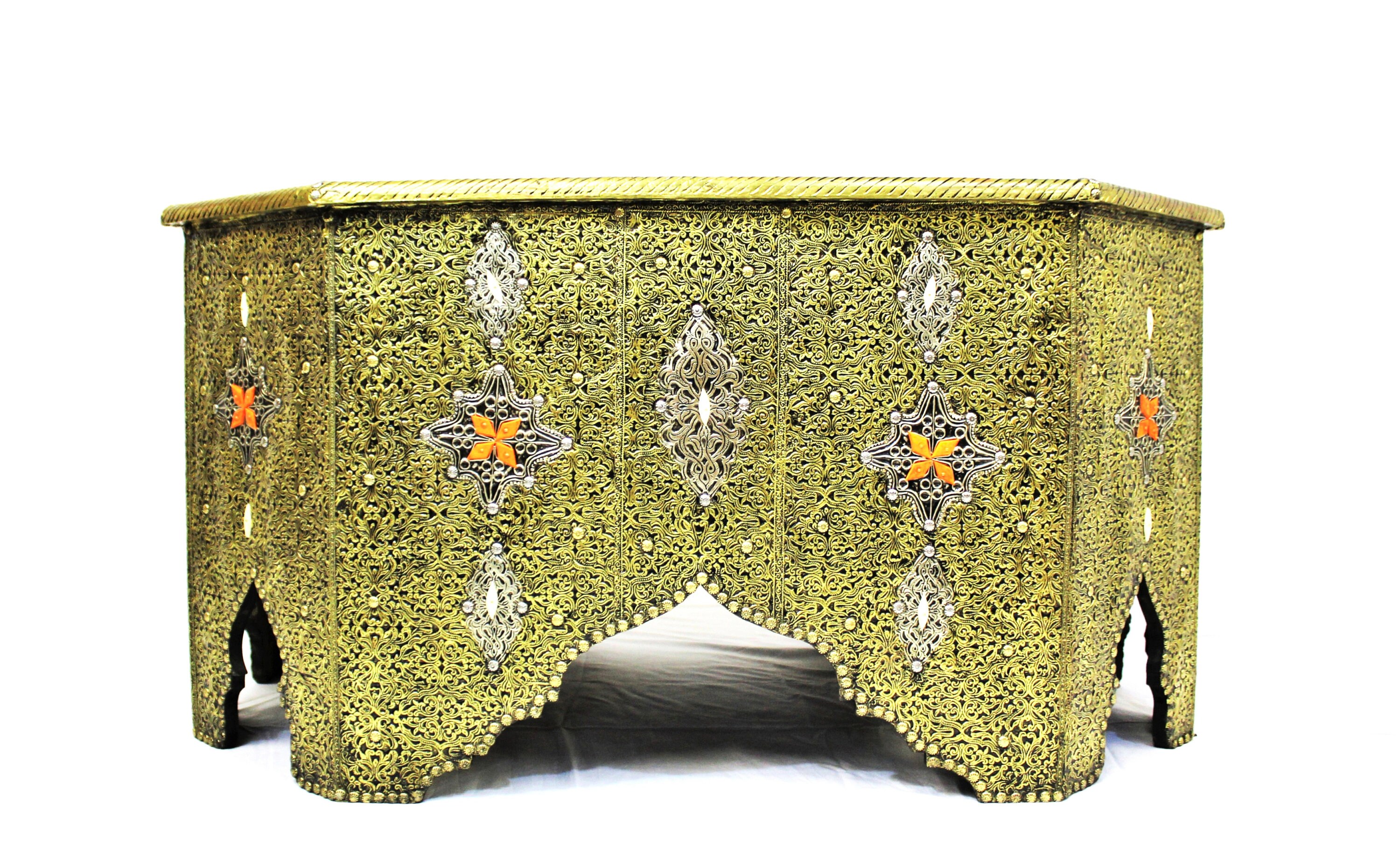 This is a beautiful authentic piece. Hand-crafted in Morocco, using fine quality materials, like wood, metal and bone, and incredible imagination of artisans. The wooden frame is dressed in hand-hammered metal of brass color and decorated with silver color metal and white and orange camel bone pieces. The design is 3-dimensional.