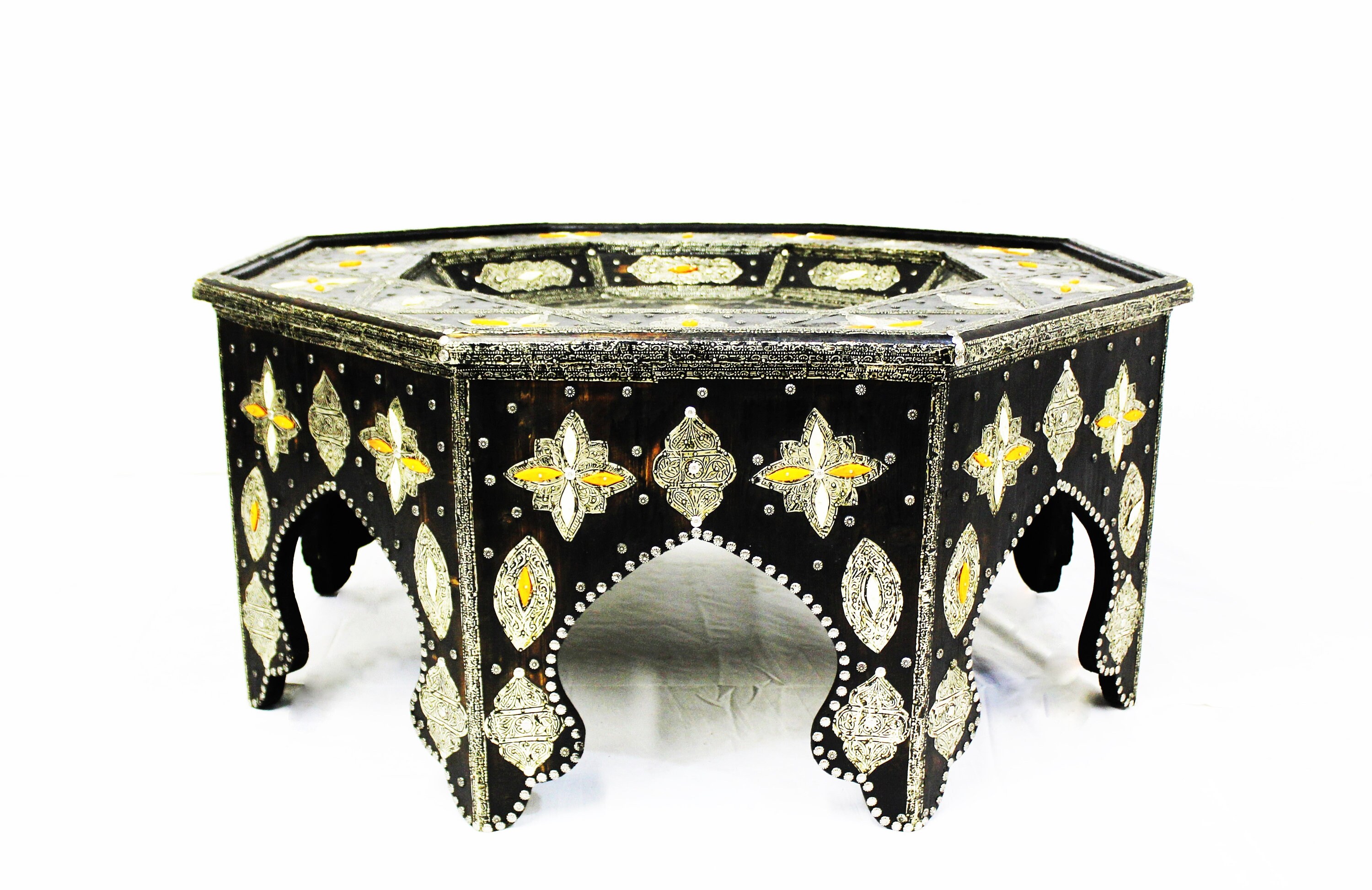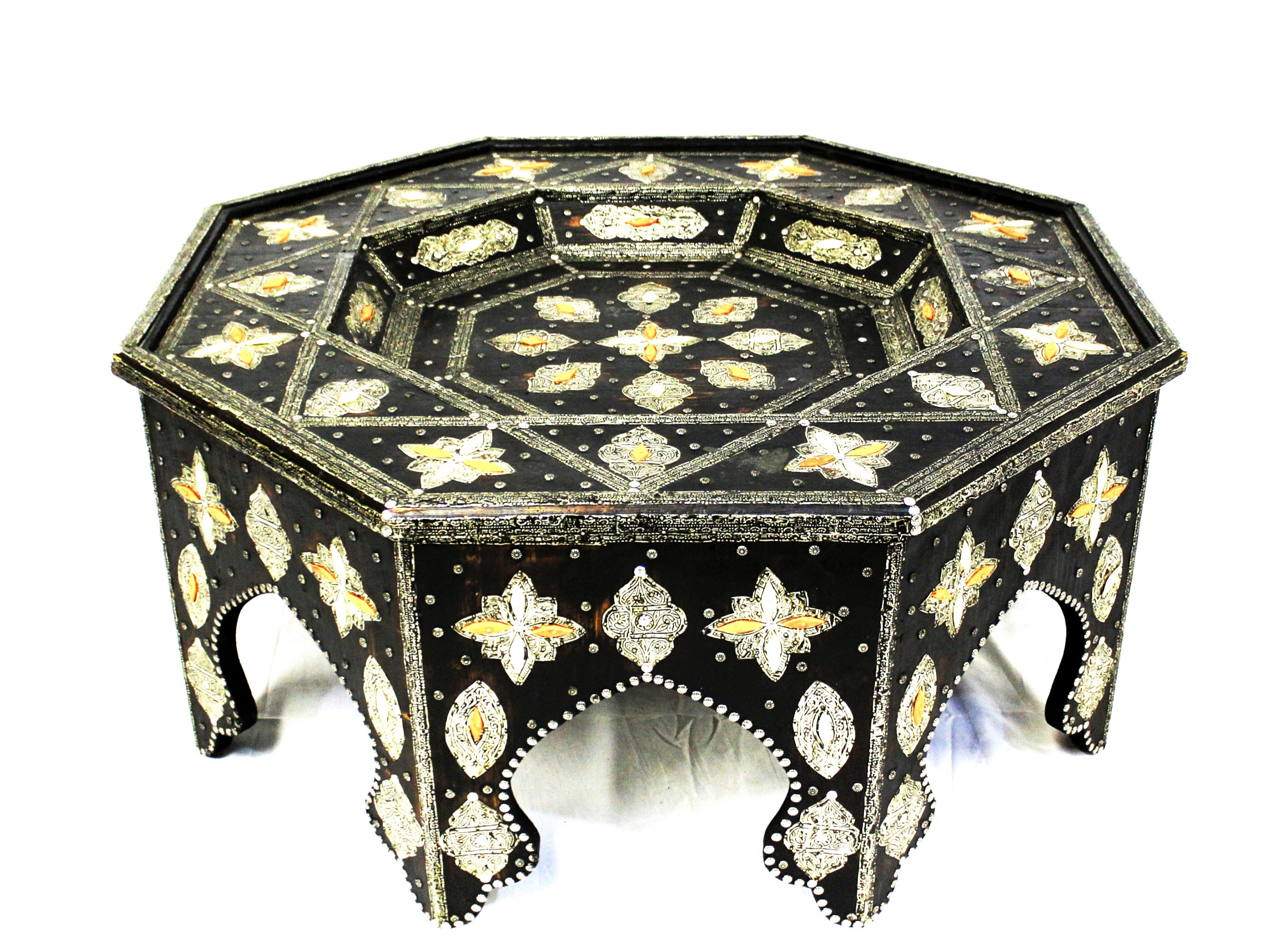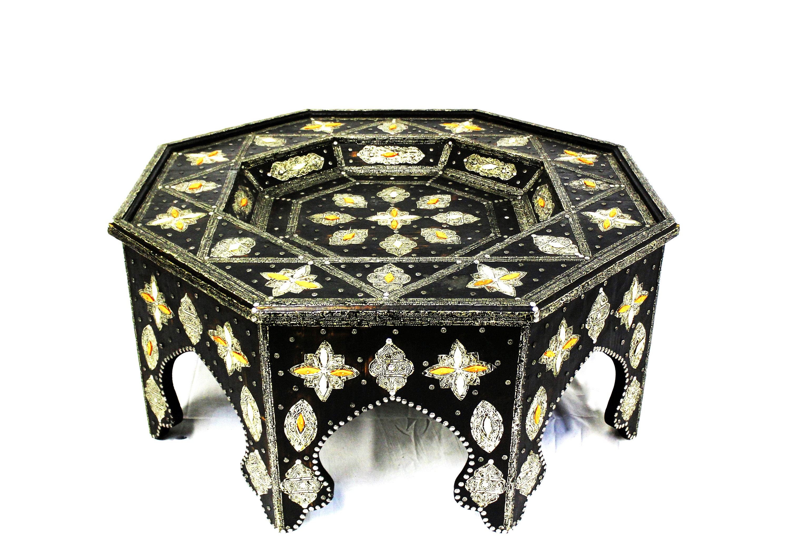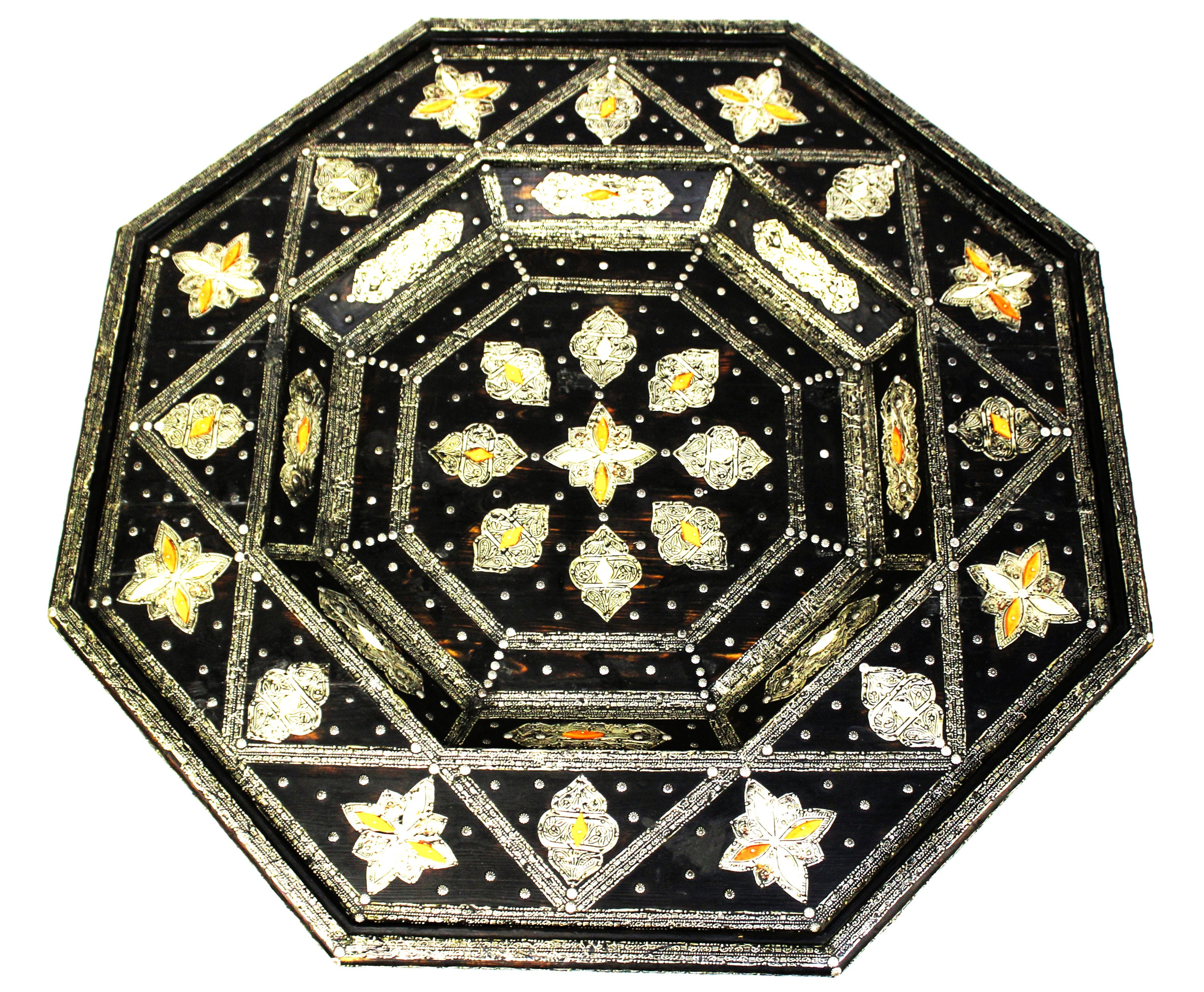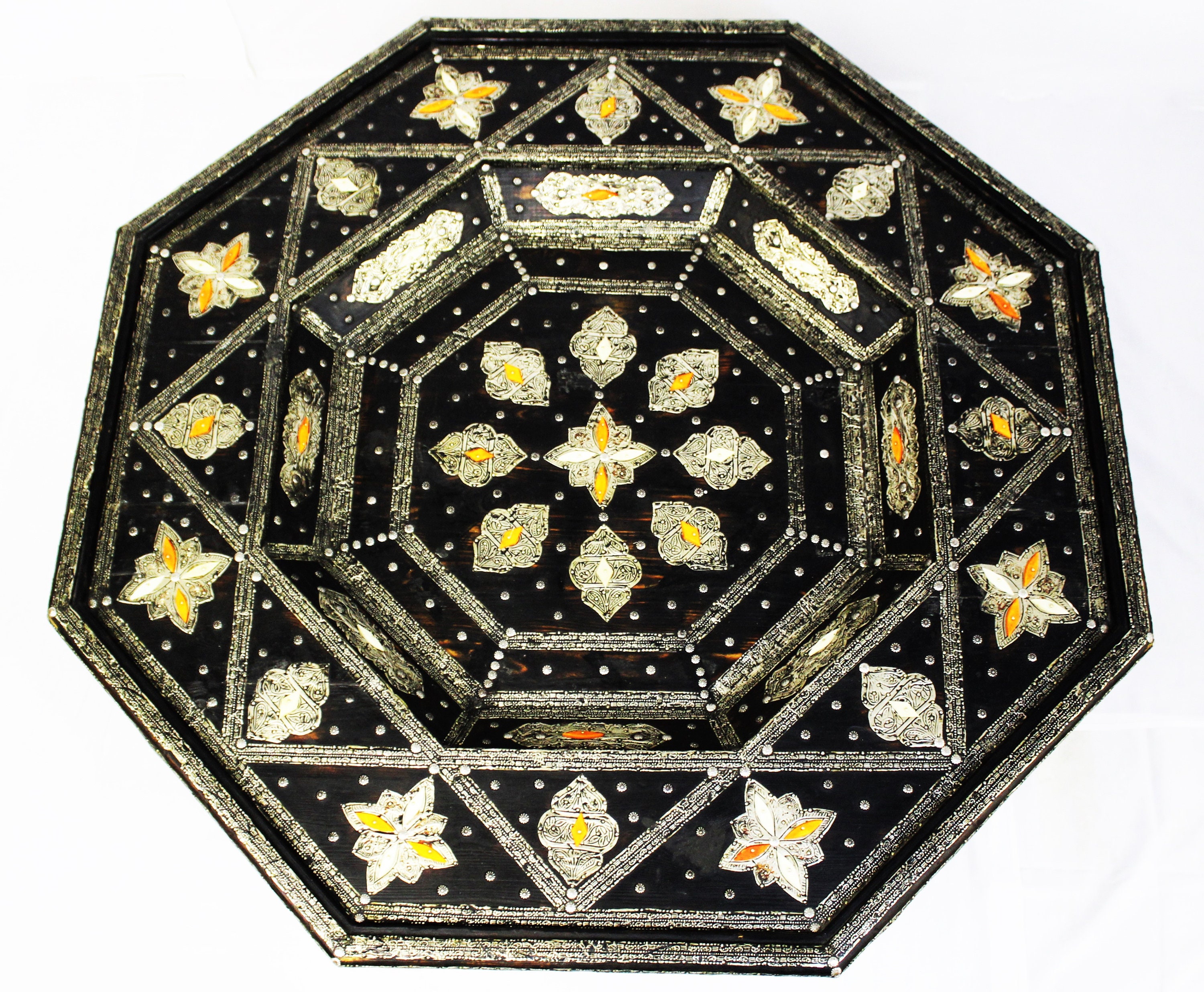 This is a beautiful authentic piece. Hand-crafted in Morocco, using fine quality materials, like wood, metal and bone, and incredible imagination of artisans. The wooden frame is decorated with hand-hammered metal and white and orange camel bone pieces. The design is 3-dimensional. On the top, there is an eight-point star, the symbol of life, in traditional Moorish designs.