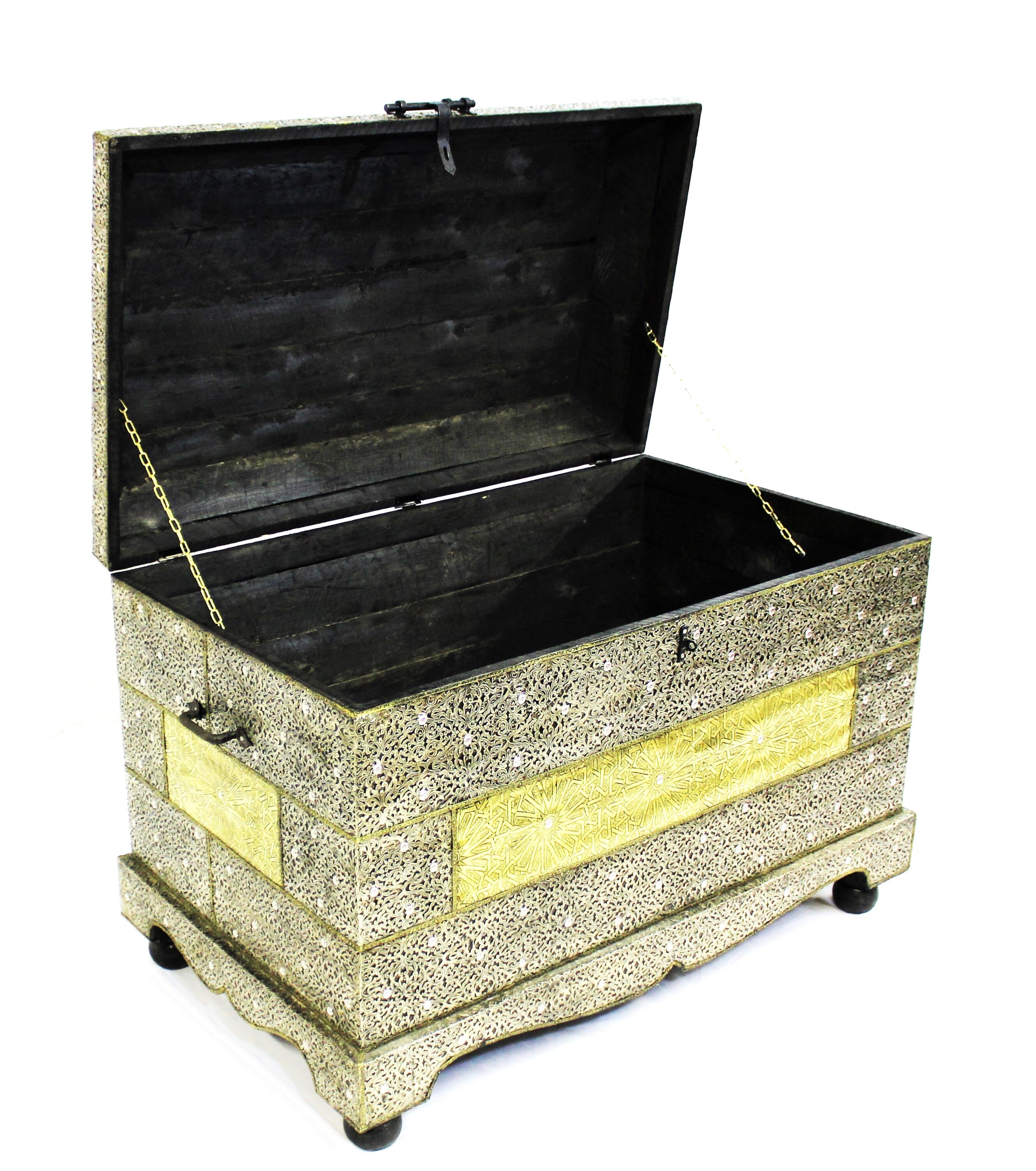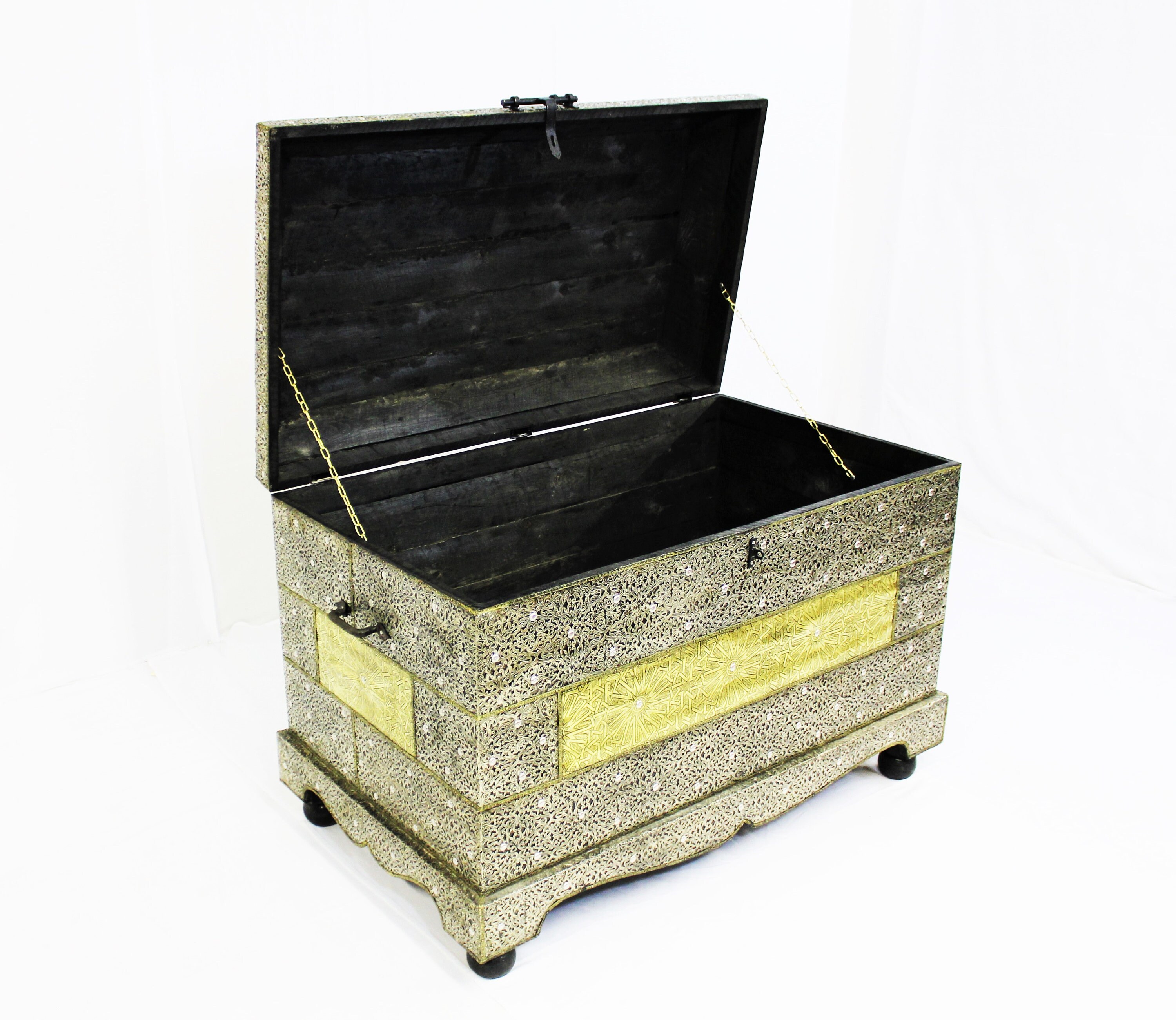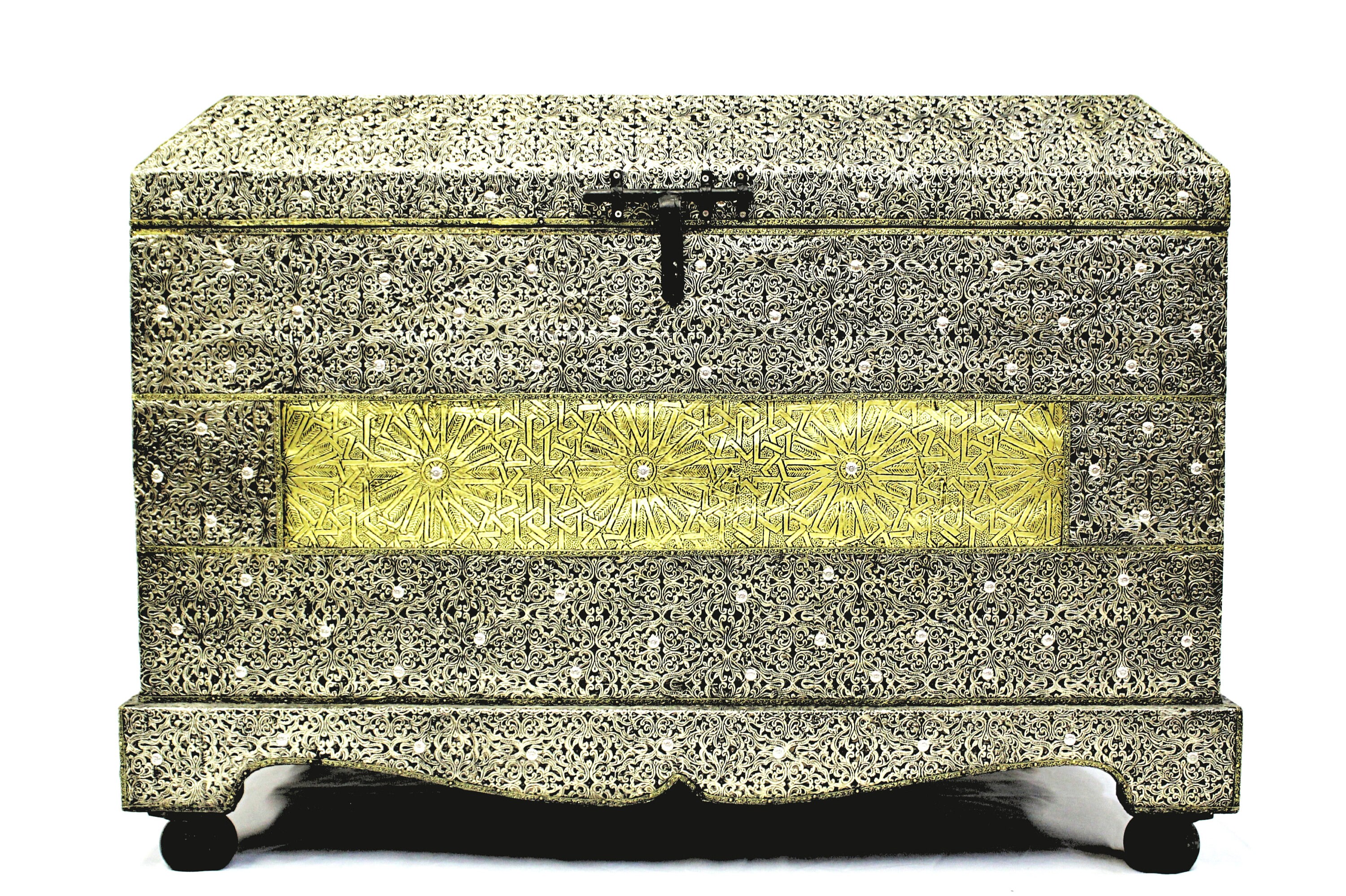 This is a beautiful authentic piece. Hand-crafted in Morocco, using fine quality materials, like wood and metal, and incredible imagination of artisans. The wooden frame is dressed in the meticulously hand-hammered metal of two tones: brass and aged silver. This chest transforms the whole room and takes you back in time to your childhood and grandma's old house where she has treasures hidden in every corner of her home. Gorgeous piece!