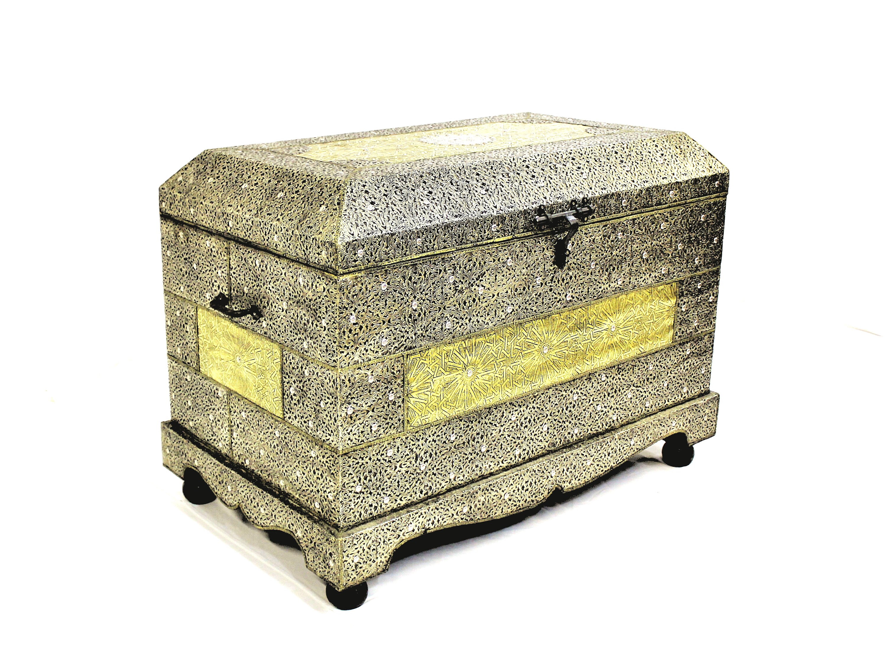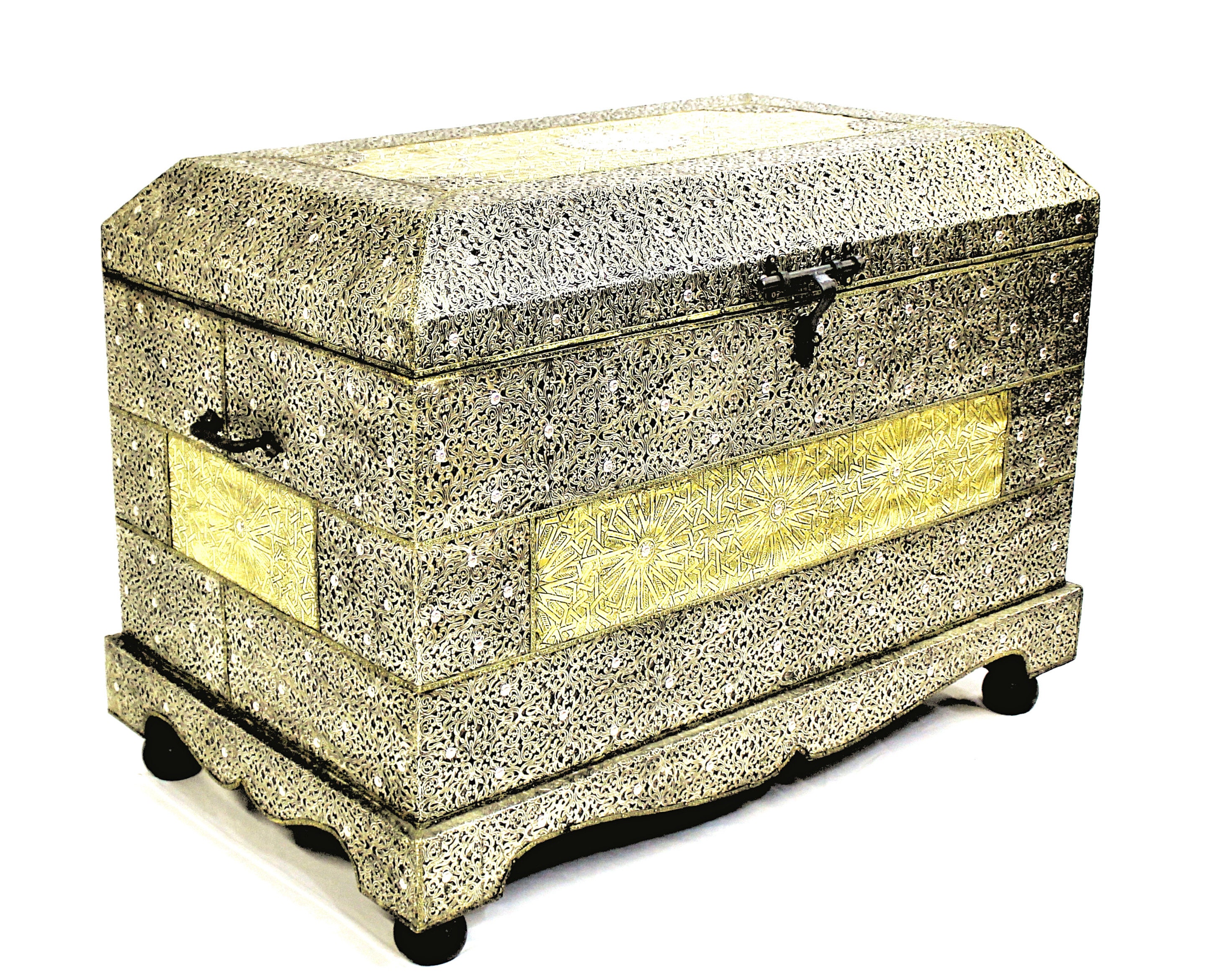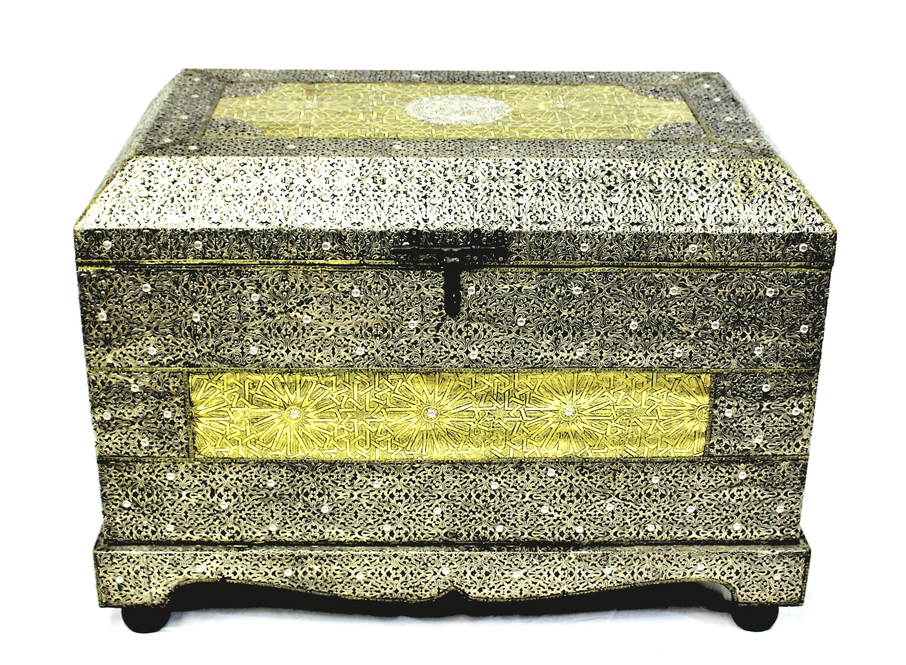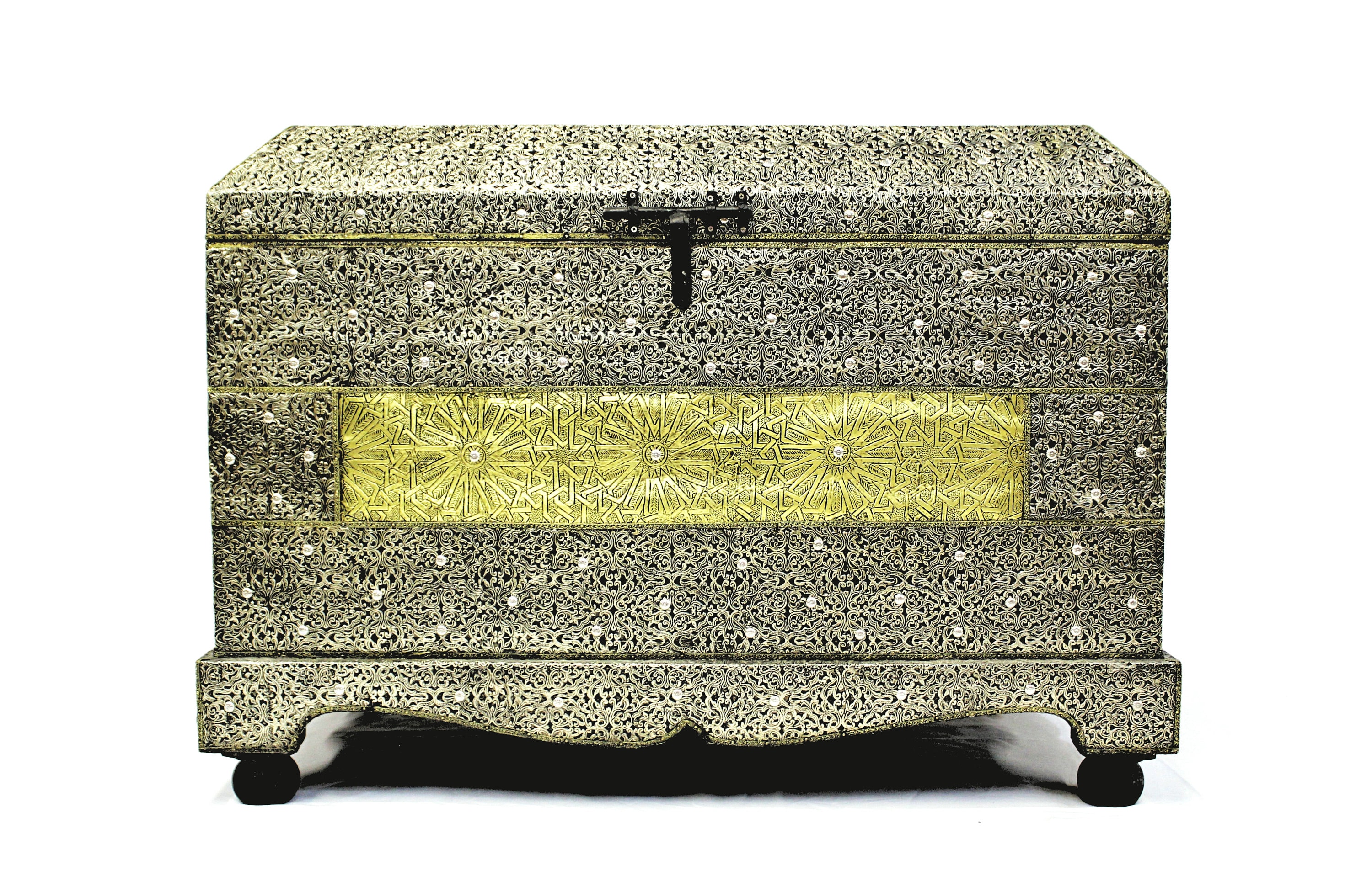 This is a beautiful authentic piece. Hand-crafted in Morocco, using fine quality materials, like wood and metal, and incredible imagination of artisans. The wooden frame is dressed in the meticulously hand-hammered metal of two tones: brass and aged silver. This chest transforms the whole room and takes you back in time to your childhood and grandma's old house where she has treasures hidden in every corner of her home. Gorgeous piece!