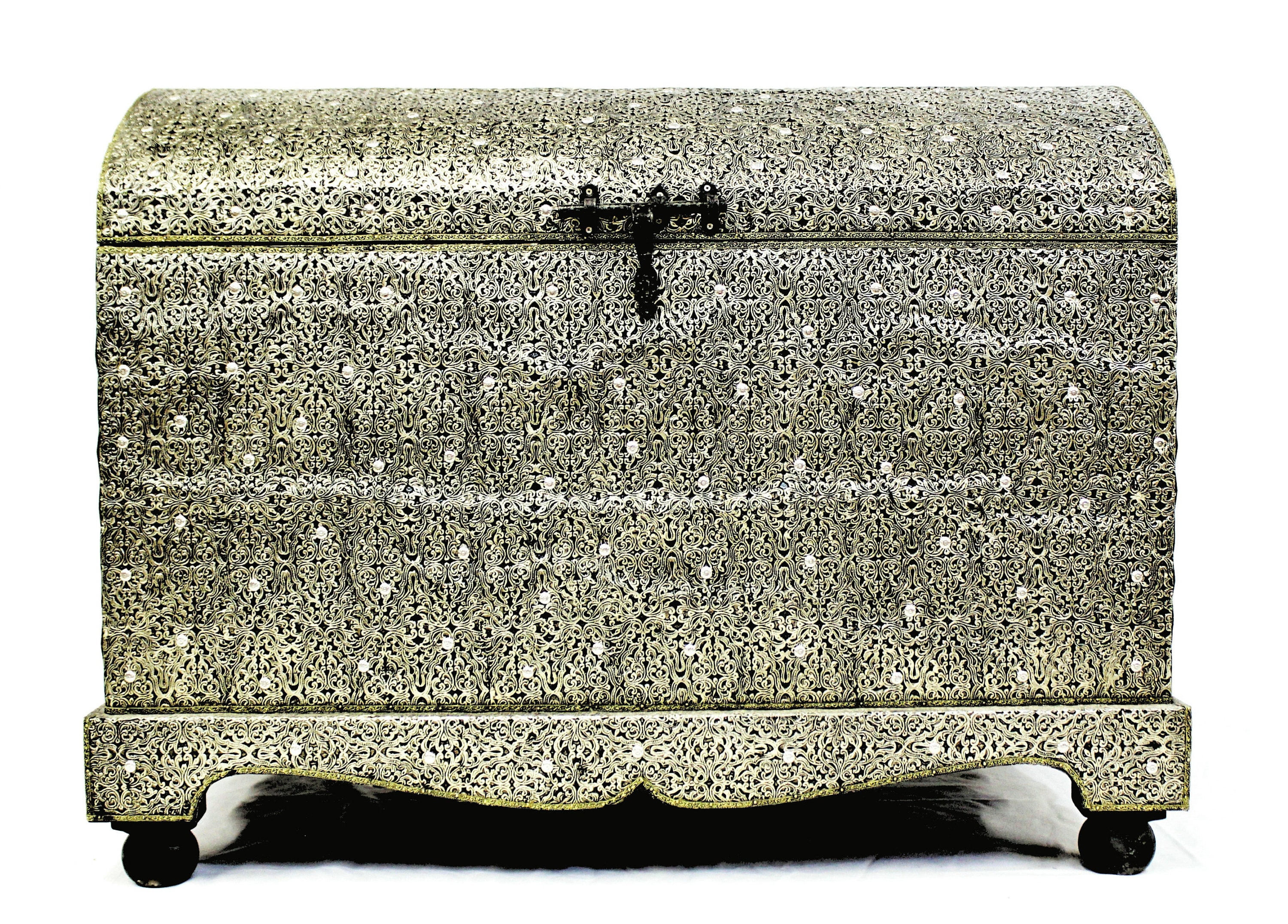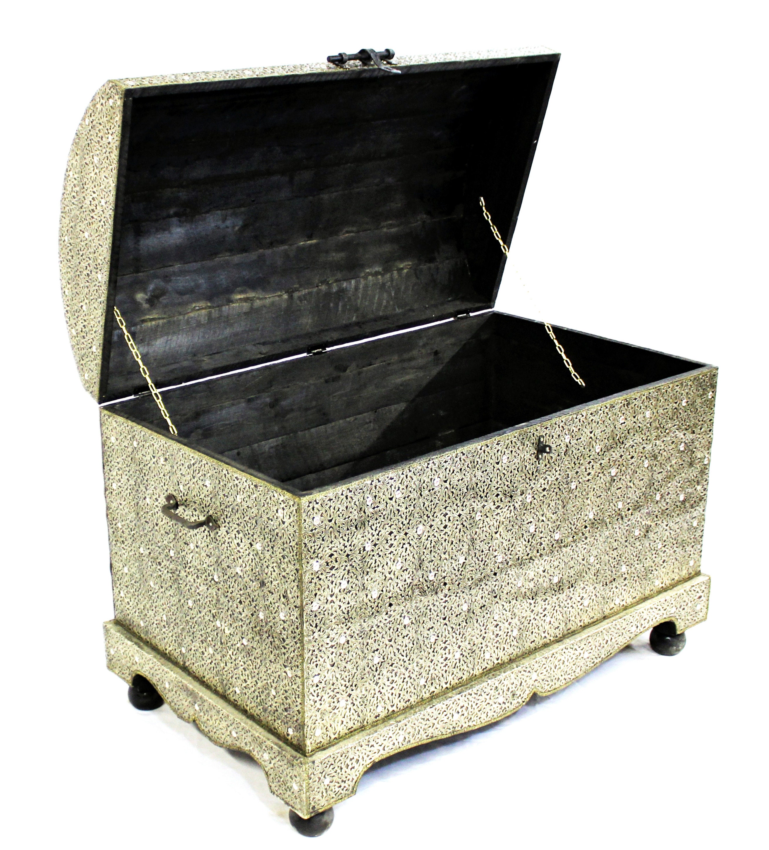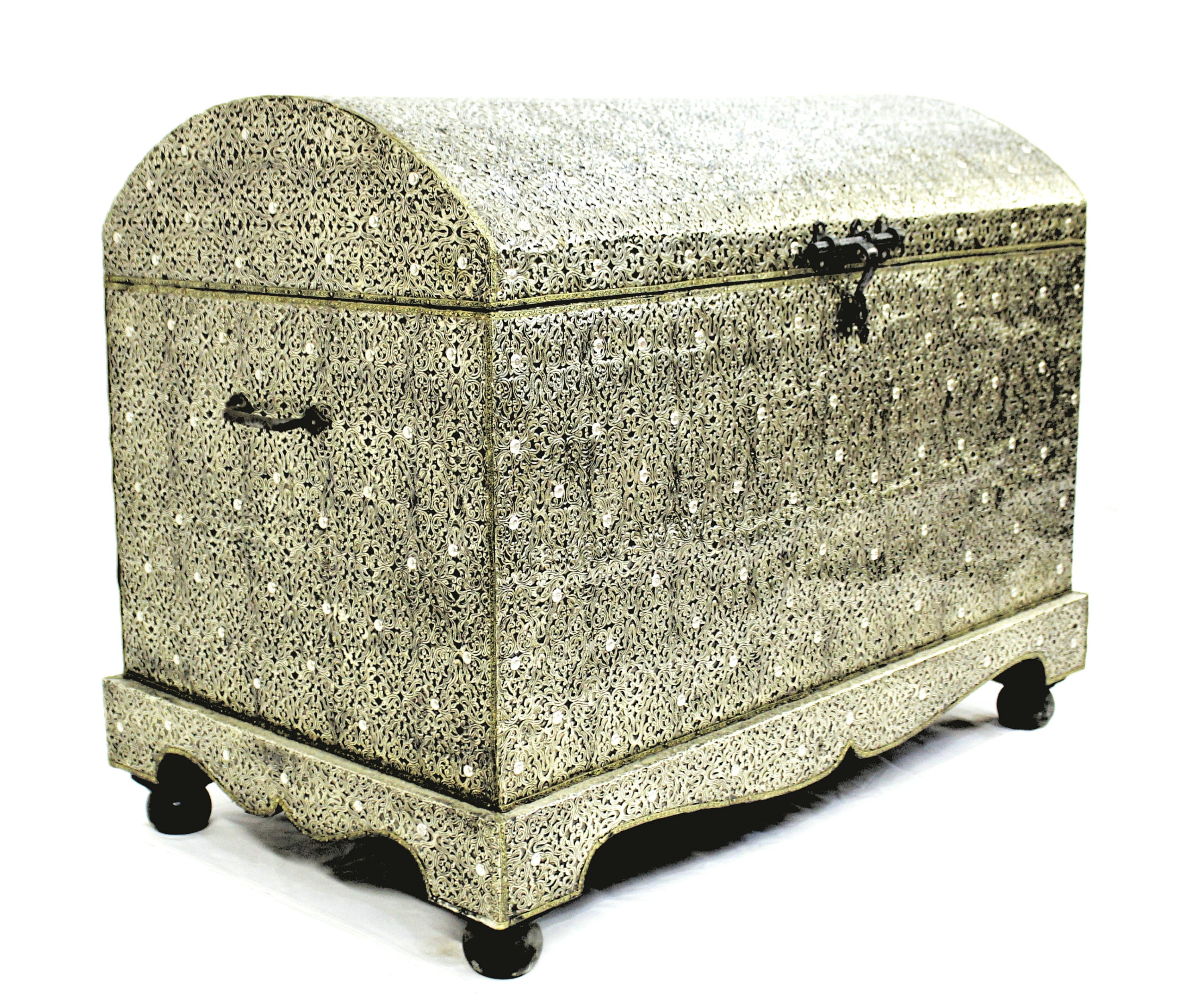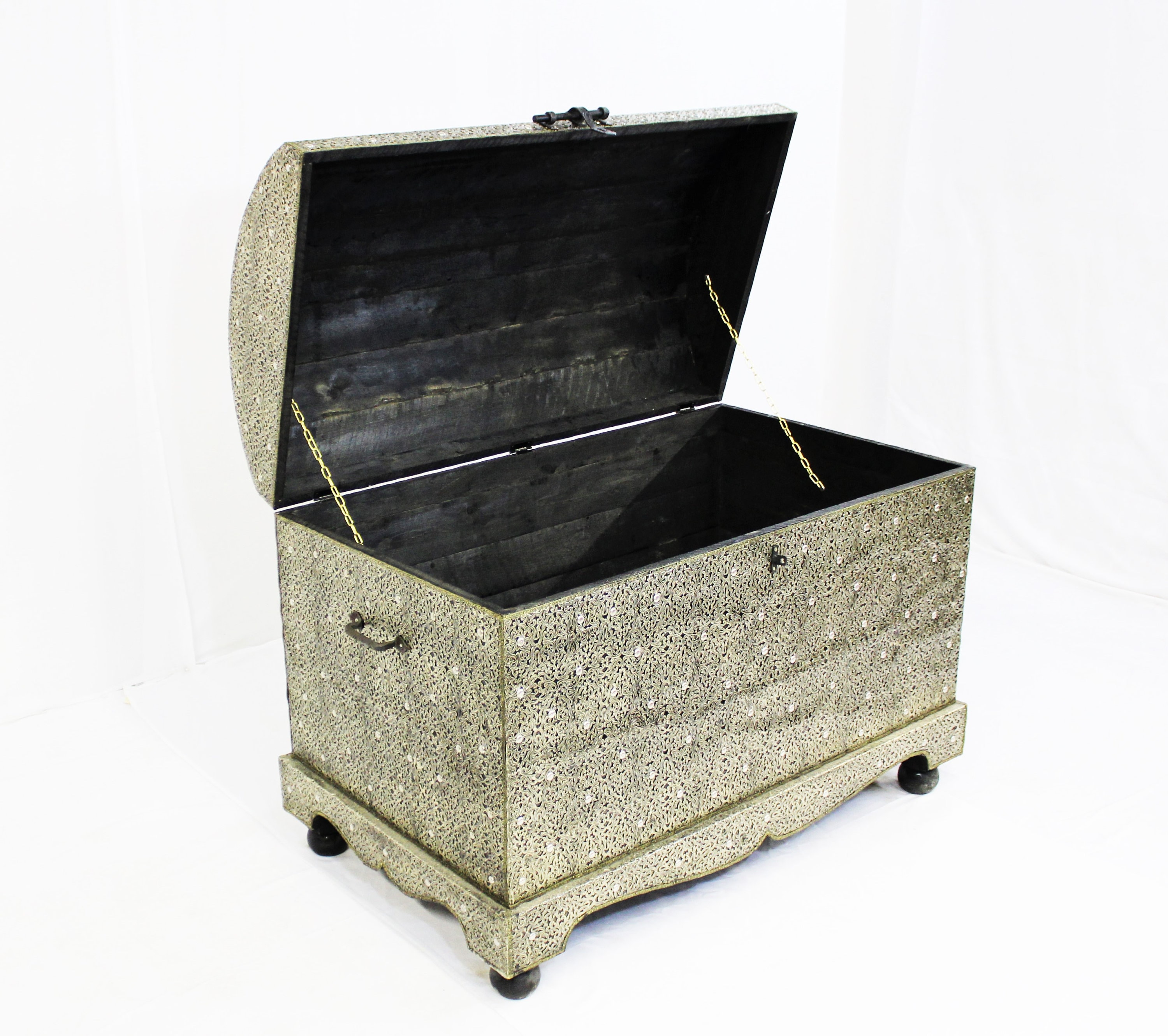 This is a beautiful authentic piece. Hand-crafted in Morocco, using fine quality materials, like wood and metal, and incredible imagination of artisans. The wooden frame is dressed in the meticulously hand-hammered metal of aged silver color. This chest transforms the whole room and takes you back in time to your childhood and grandma's old house where she has treasures hidden in every corner of her home. Gorgeous piece!