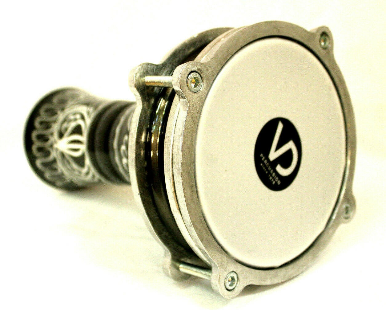 This is a nice small drum. It came from Turkey. The body is aluminum. The etched design was made by hands with a needle on wet paint. The vibrant blue color encourages you to play the drum right away.