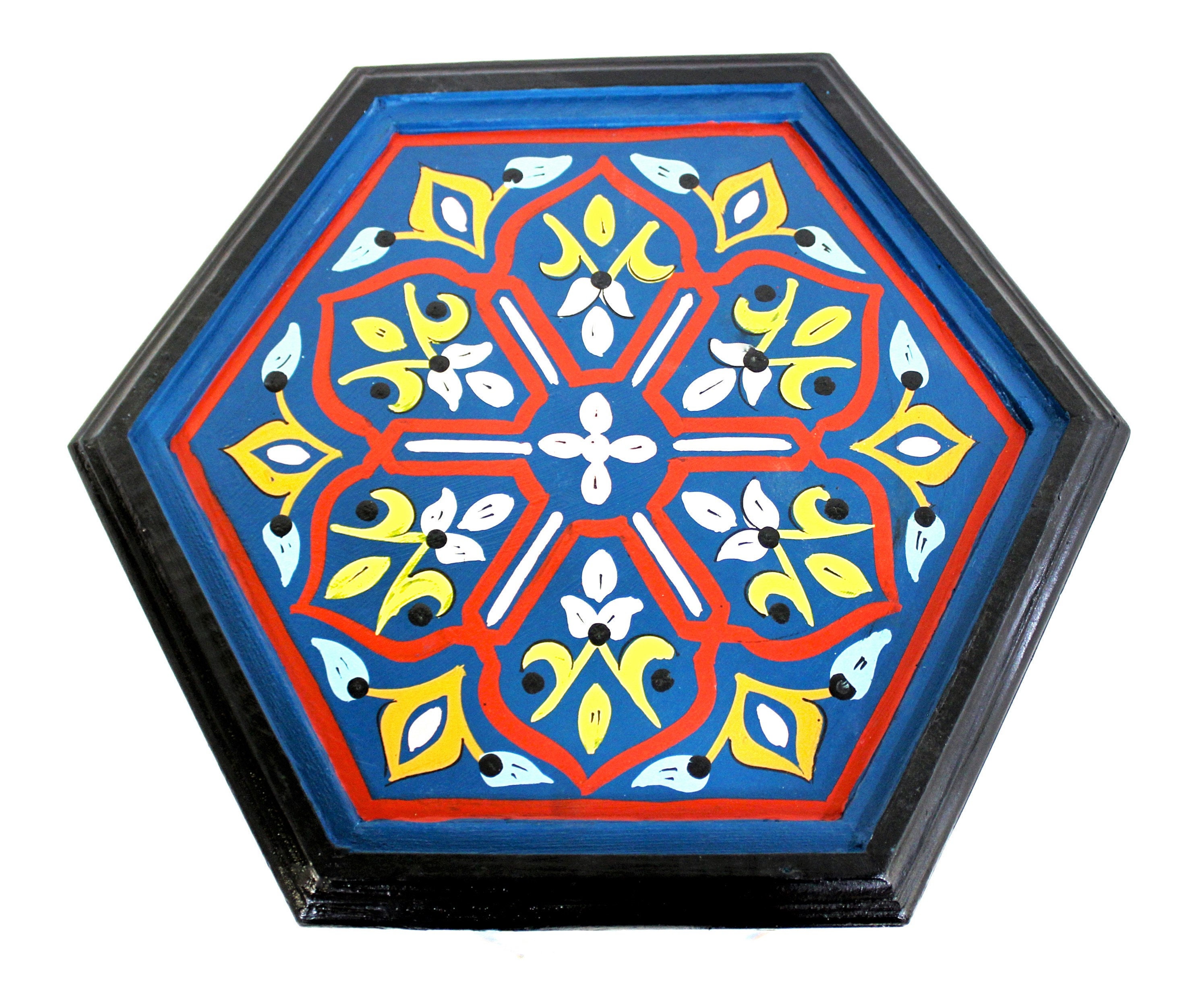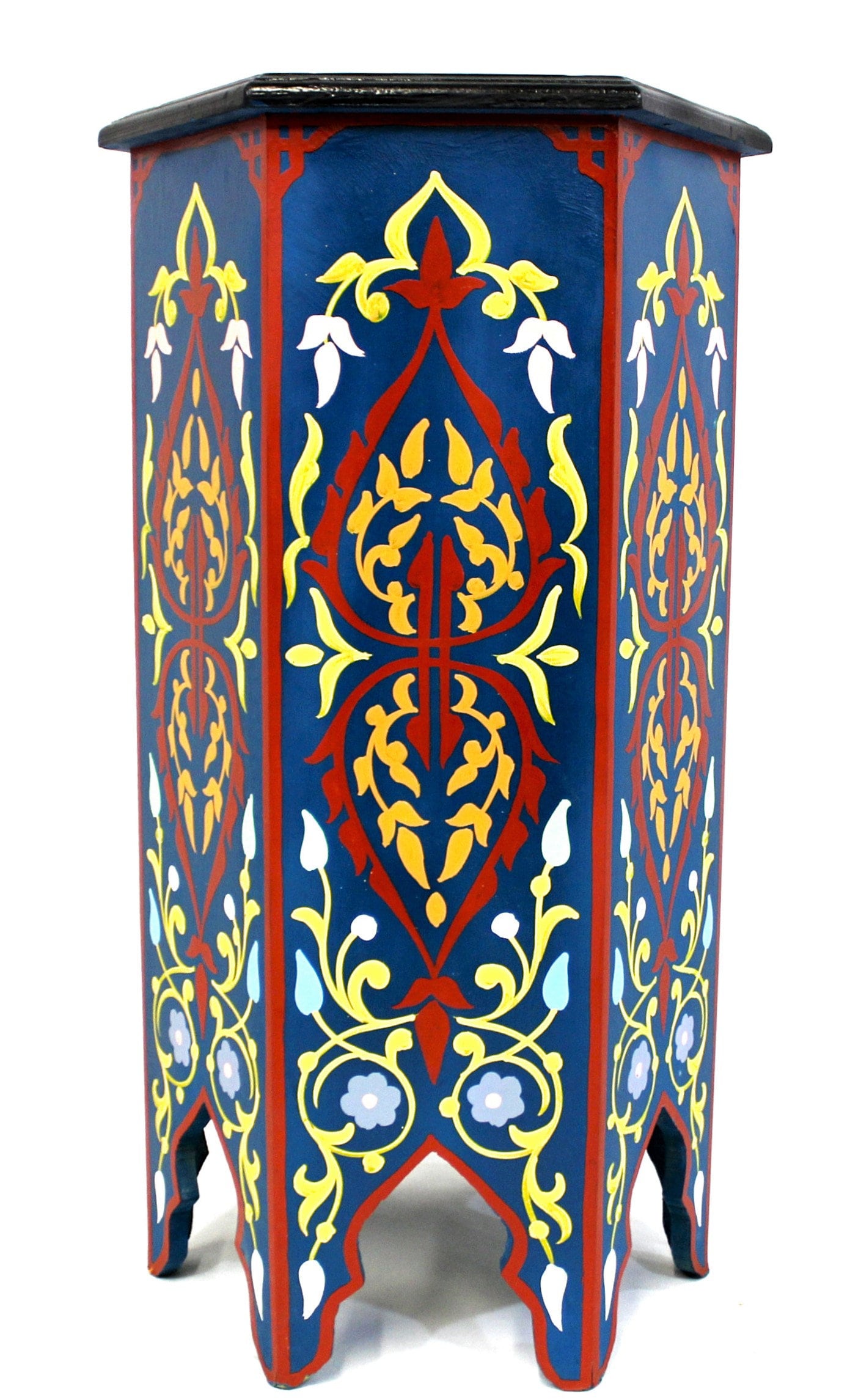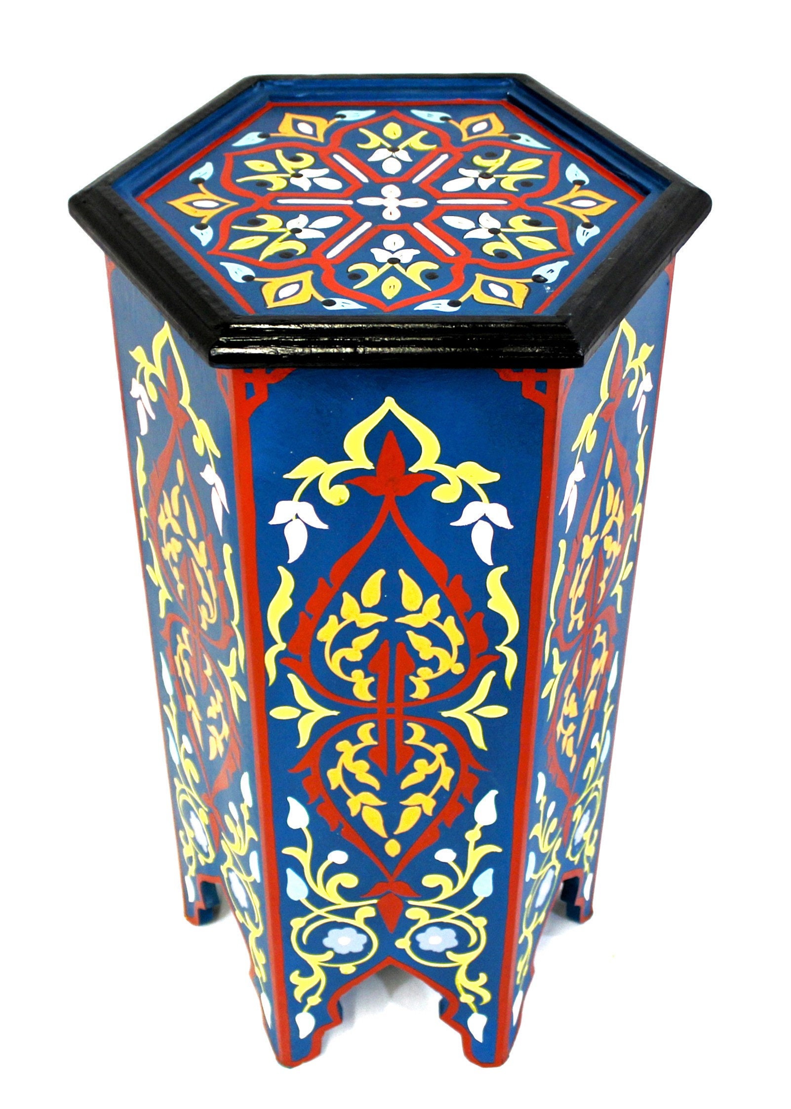 This is a beautiful authentic piece. Hand-crafted in Morocco, using fine quality materials and incredible imagination of artisans. The table is hand-painted. It's made in the shape a hexagon. A perfect pedestal table that will add a special charm to your room.