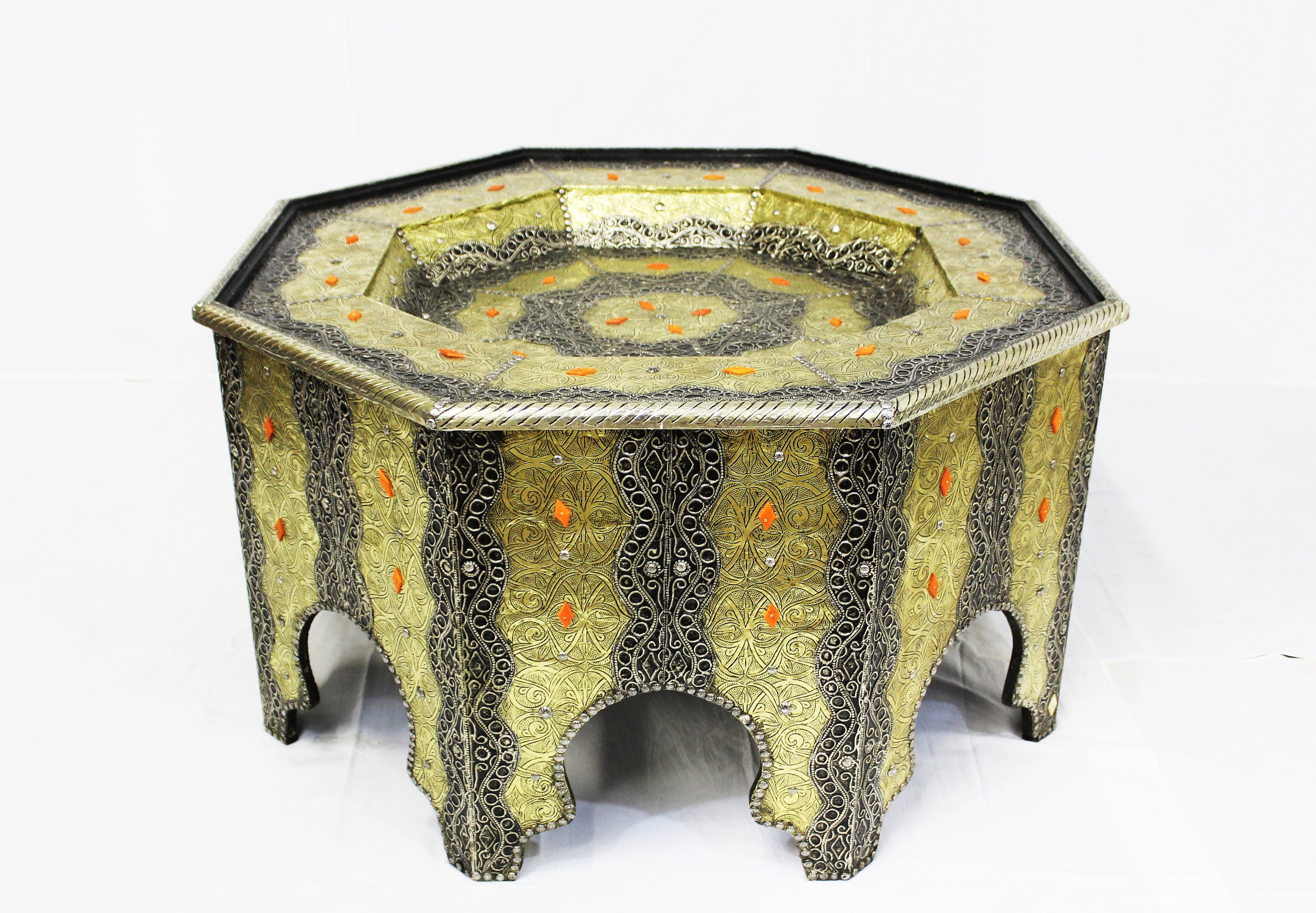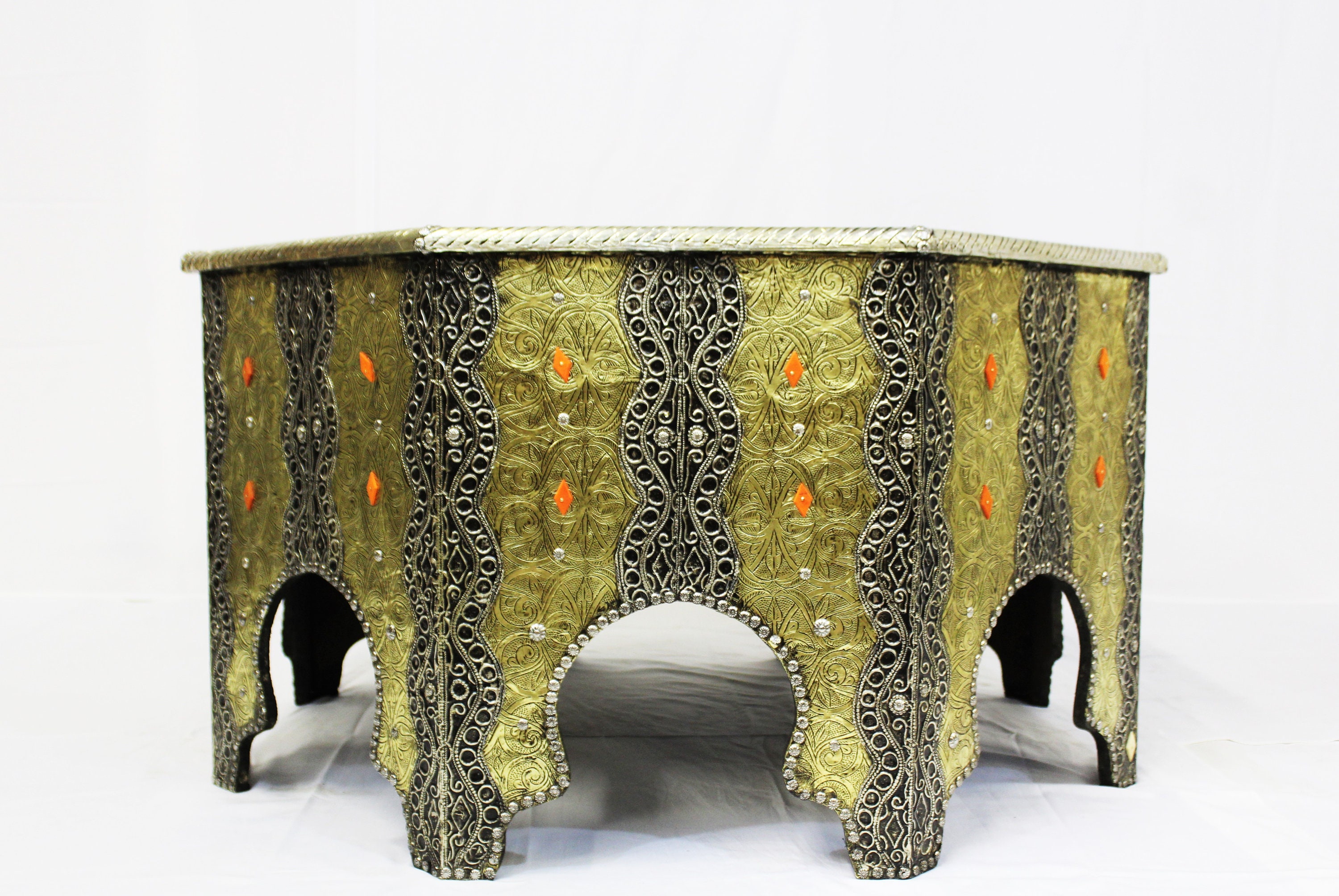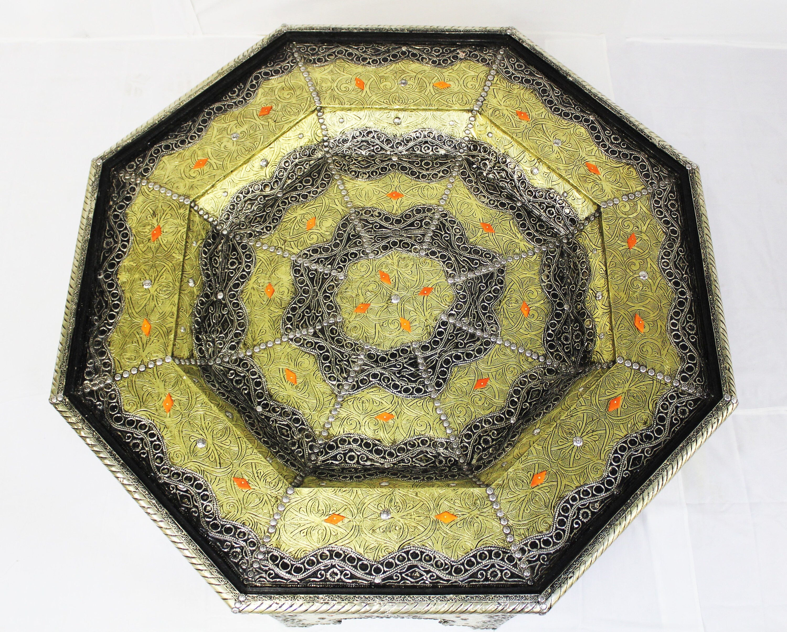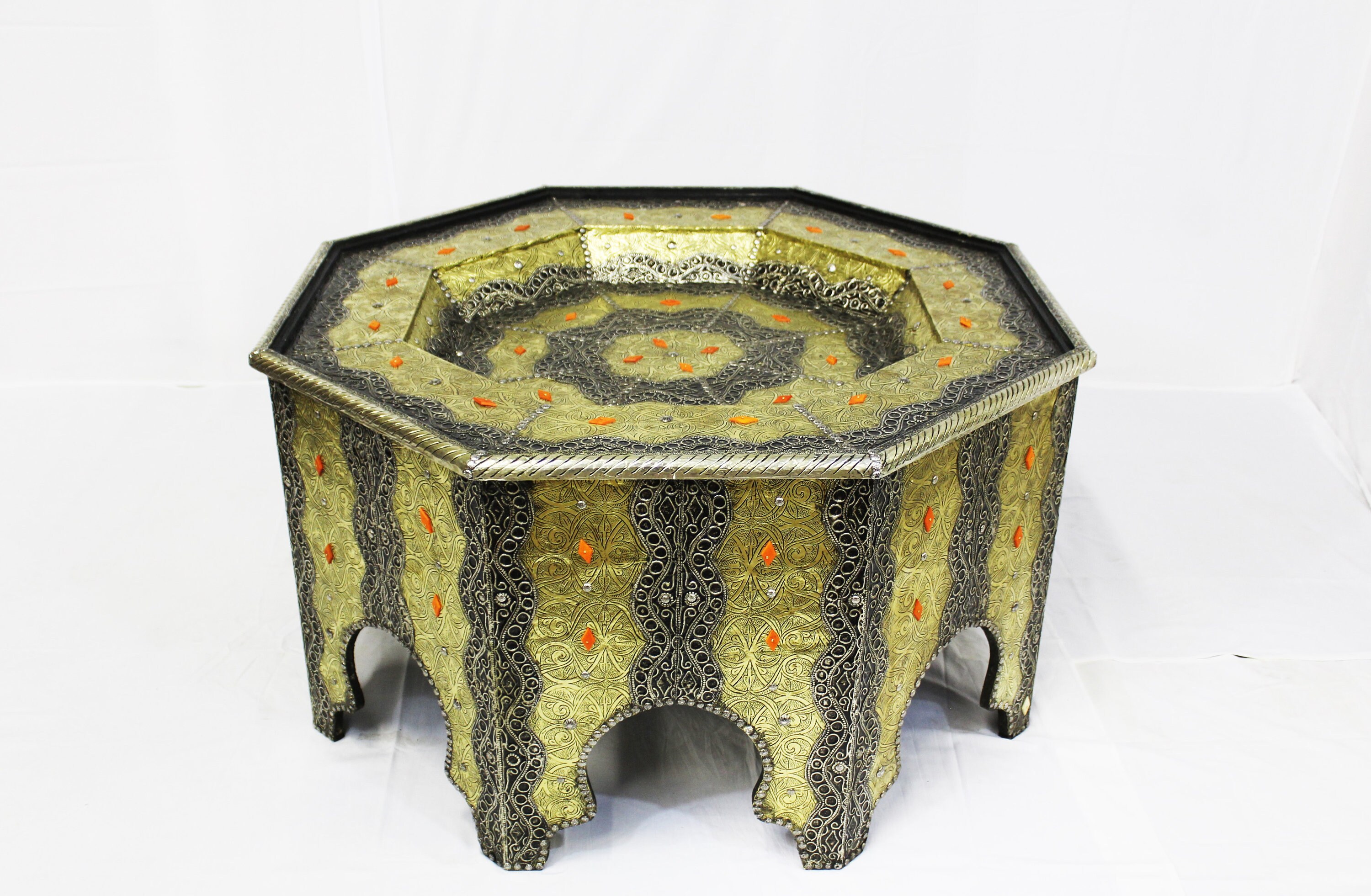 This is a beautiful authentic piece. Hand-crafted in Morocco, using fine quality materials, like wood, metal and bone, and incredible imagination of artisans. The wooden frame is dressed in hand-hammered 2-tone metal and decorated with orange camel bone pieces. The design is 3-dimensional.