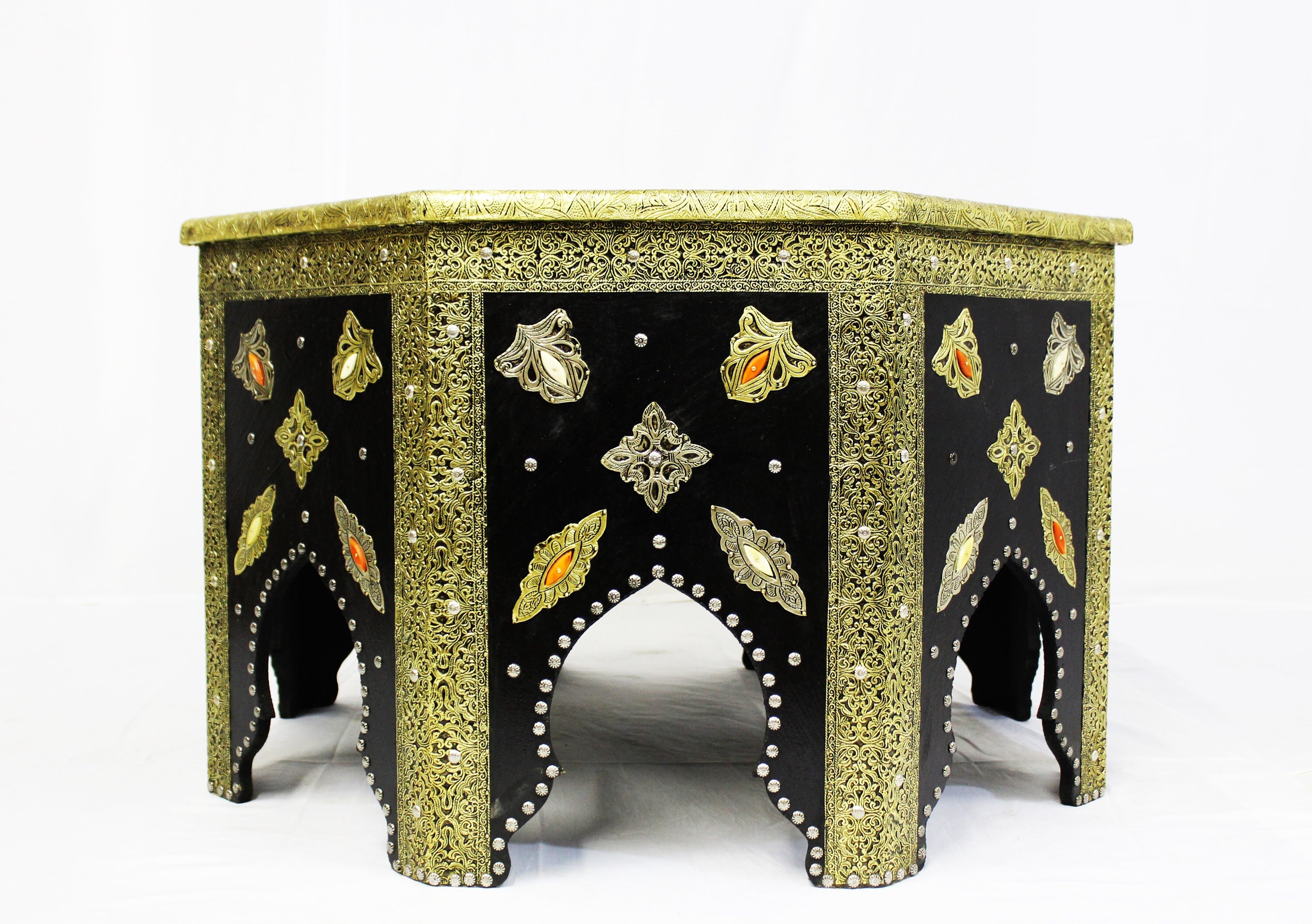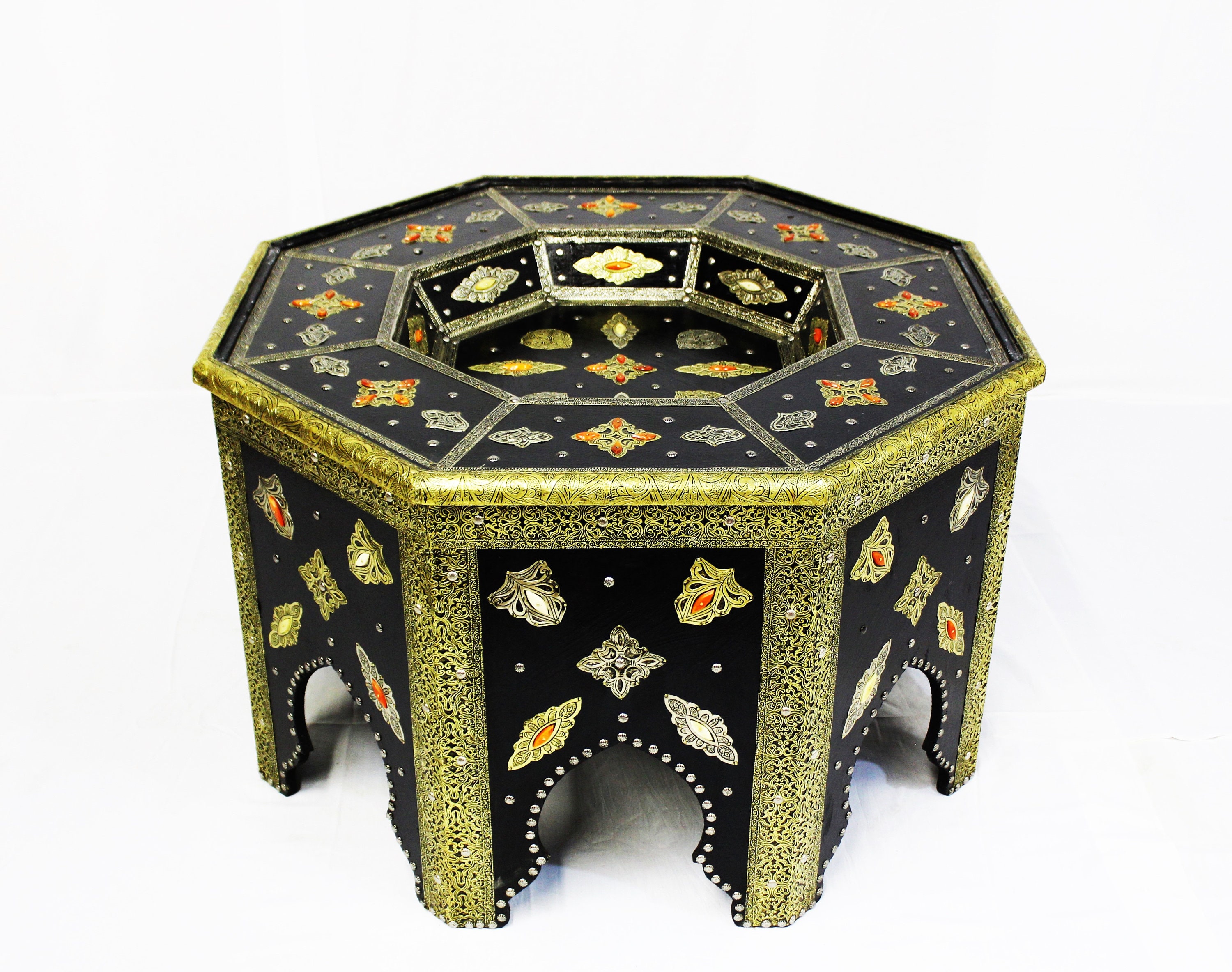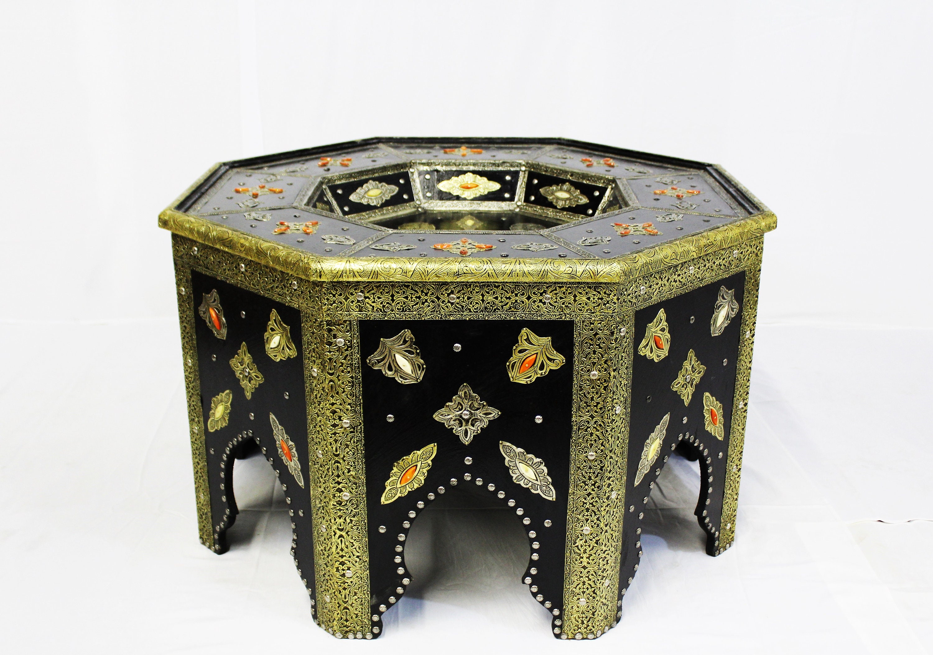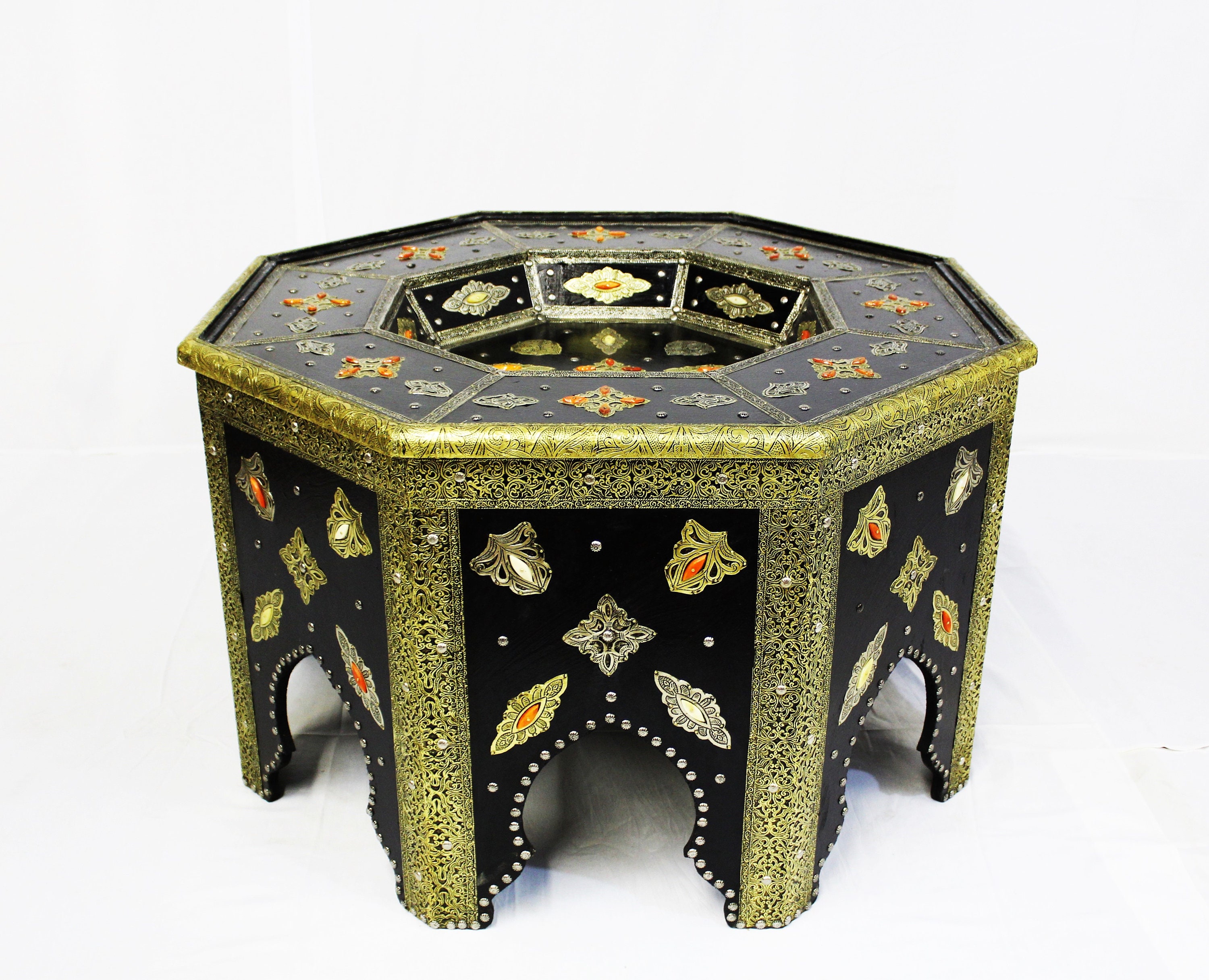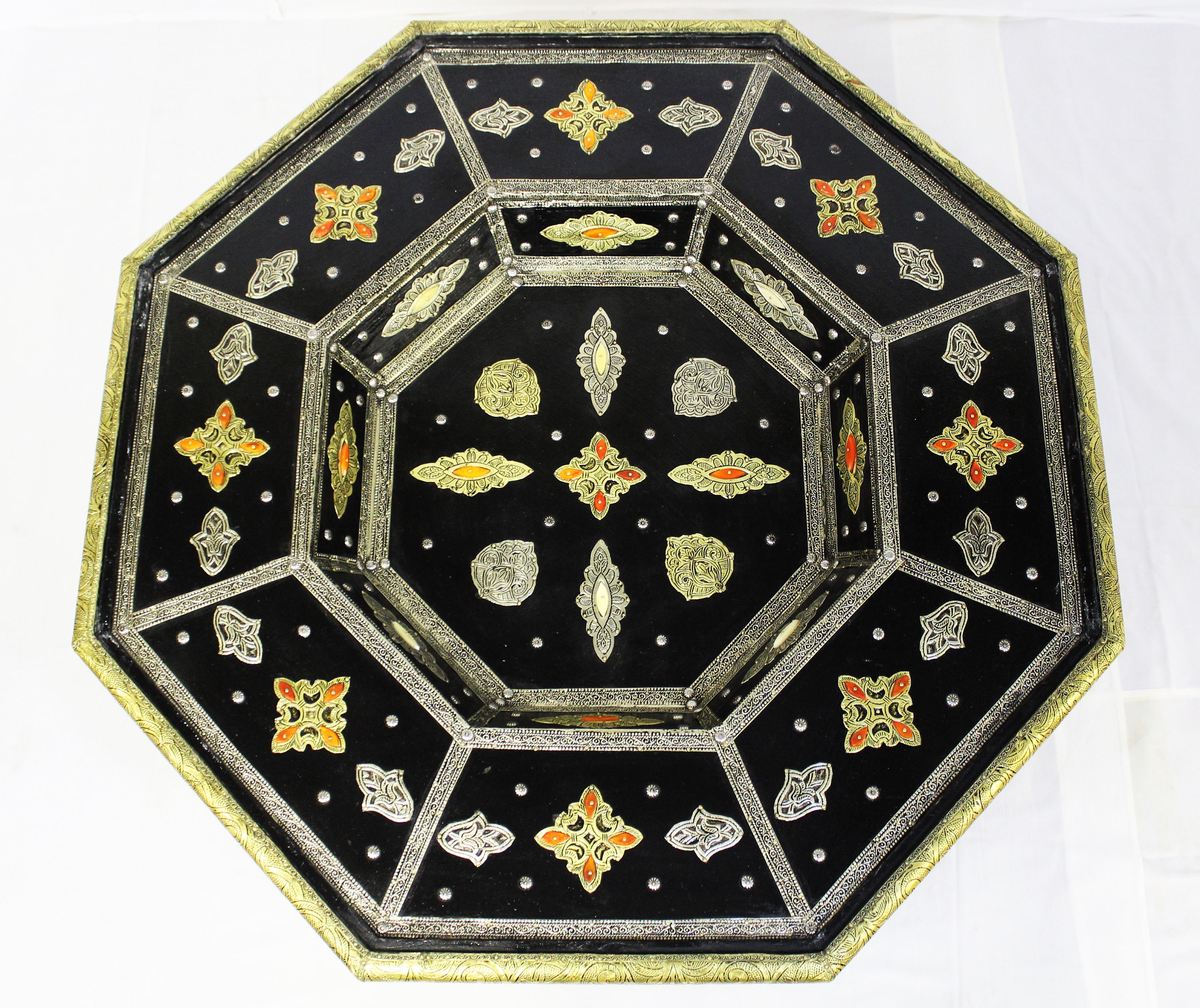 This is a beautiful authentic piece. Hand-crafted in Morocco, using fine quality materials, like wood, metal and bone, and incredible imagination of artisans. The wooden frame is decorated with 2-tone hand-hammered metal and colorful camel bone inlay. The design is 3-dimensional.