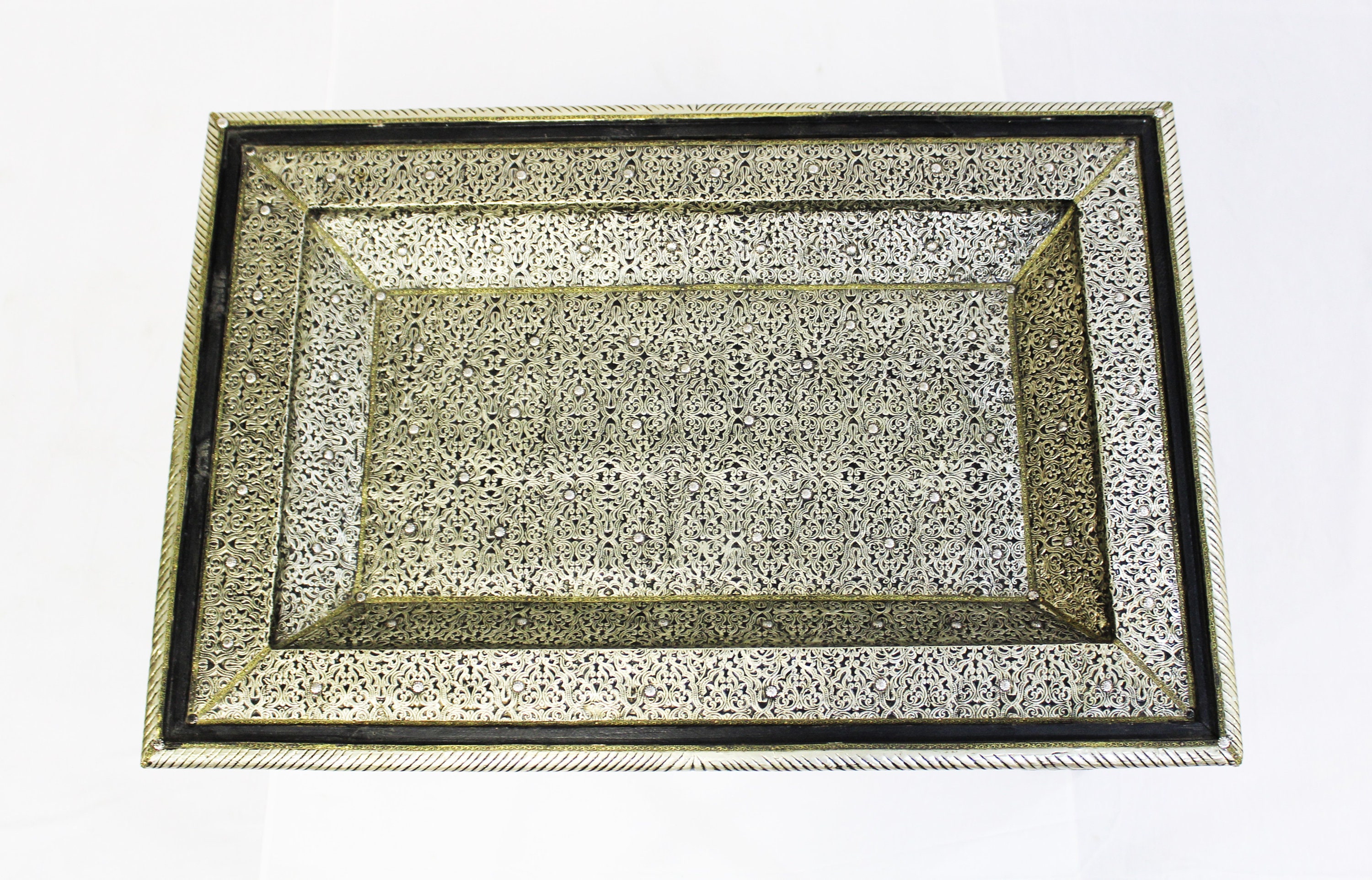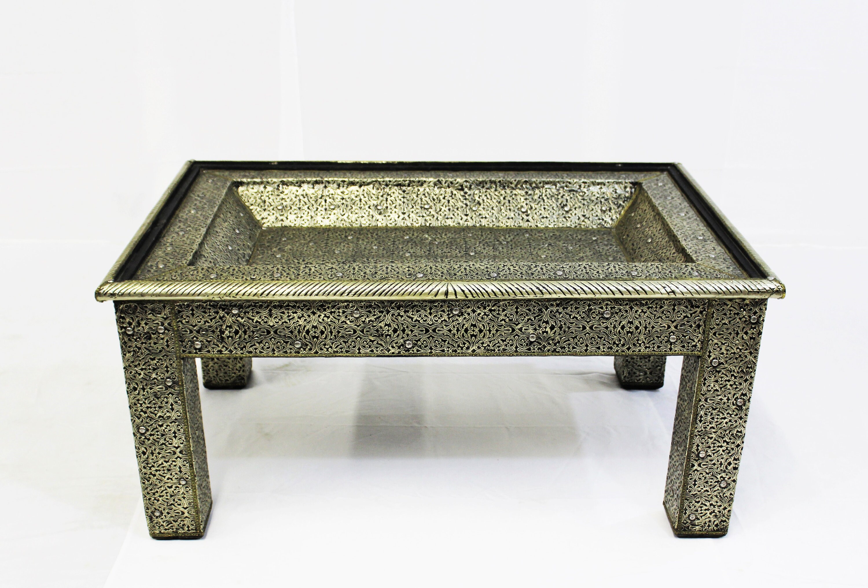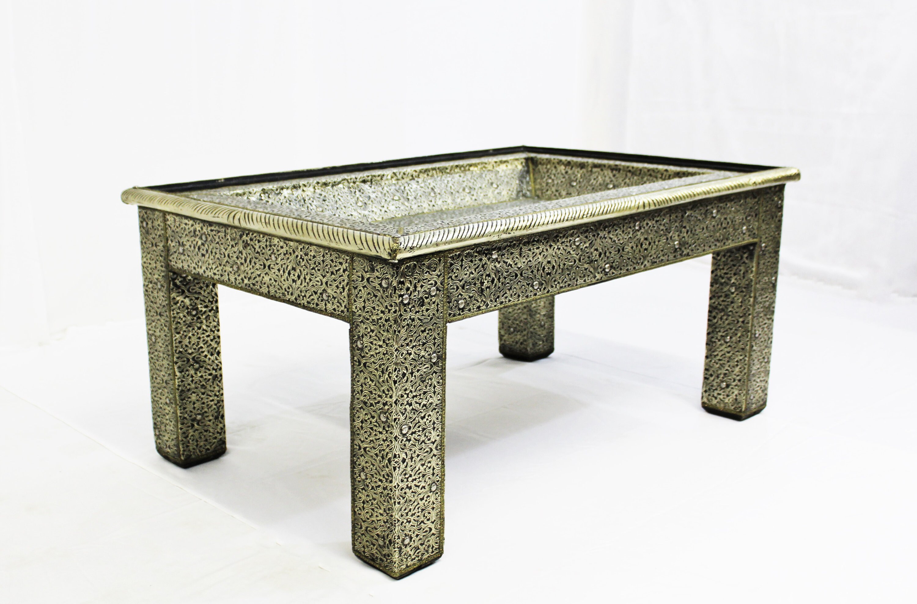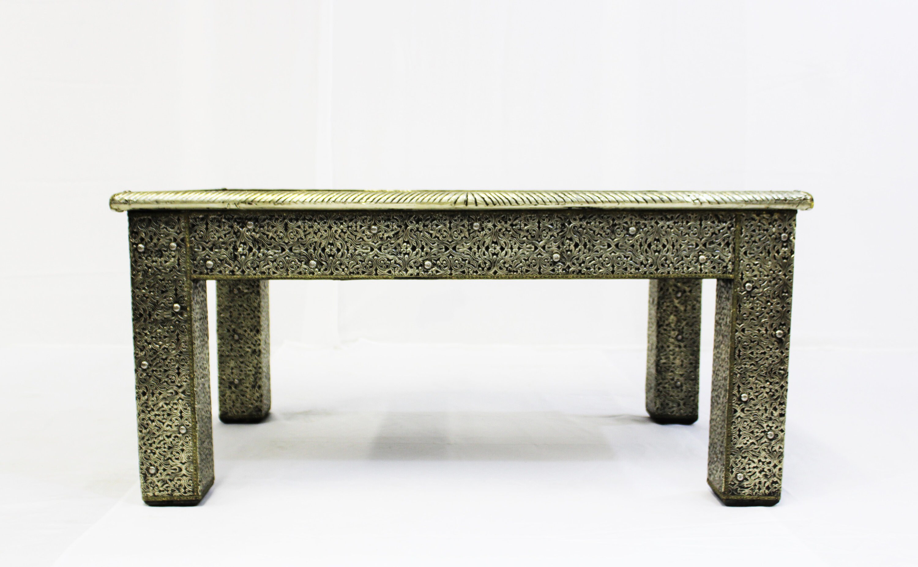 This is a beautiful authentic piece. Hand-crafted in Morocco, using fine quality materials, like wood and metal, and incredible imagination of artisans. The wooden frame is dressed in meticulously hand-hammered metal. The design is 3-dimensional.