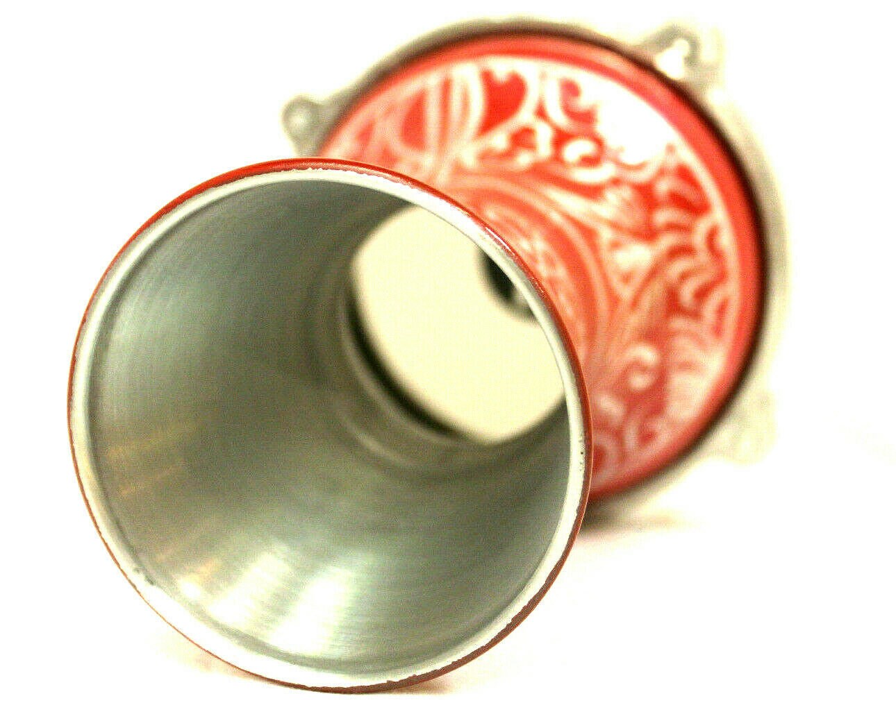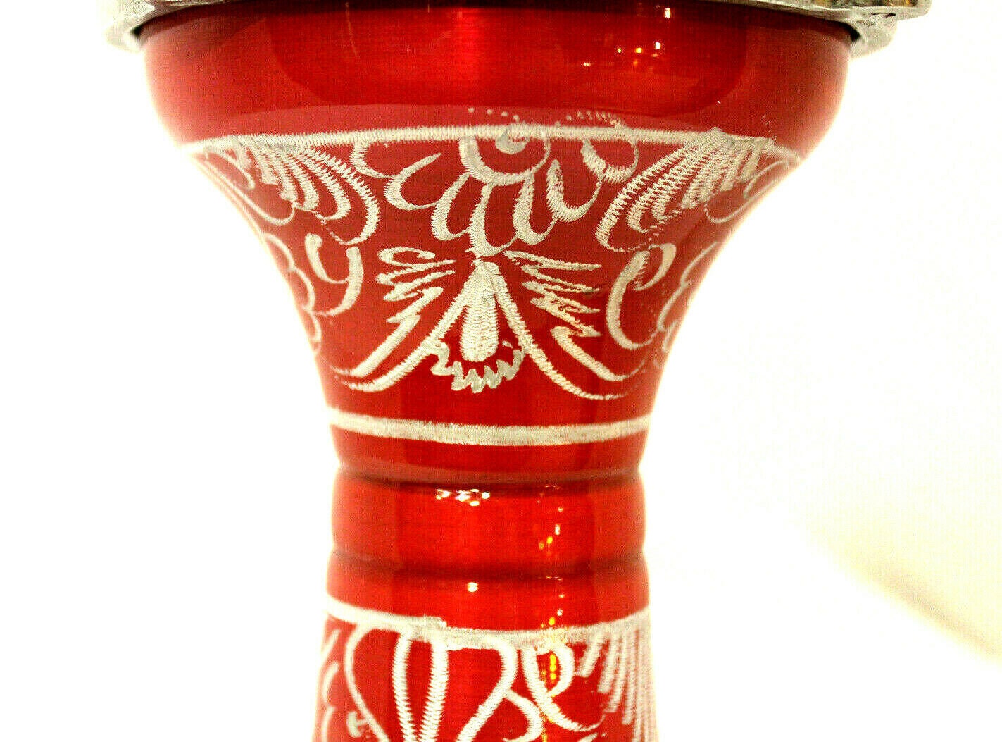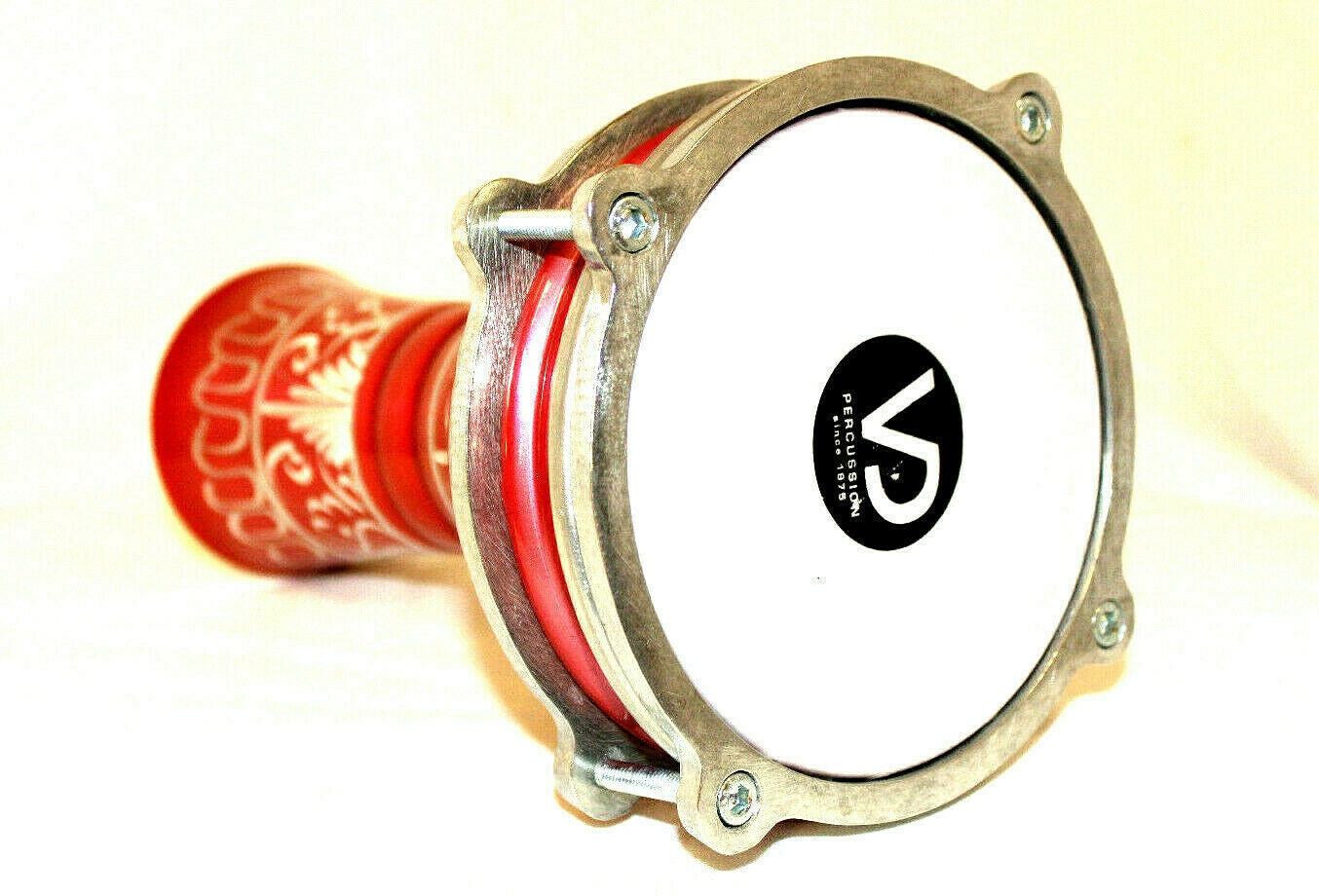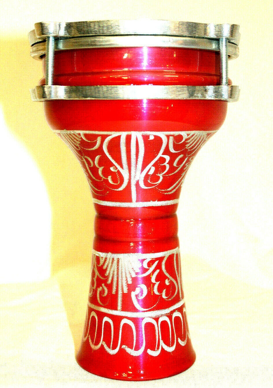 This is a nice small drum. It came from Turkey. The body is aluminum. The etched design was made by hands with a needle on wet paint. The vibrant blue color encourages you to play the drum right away.