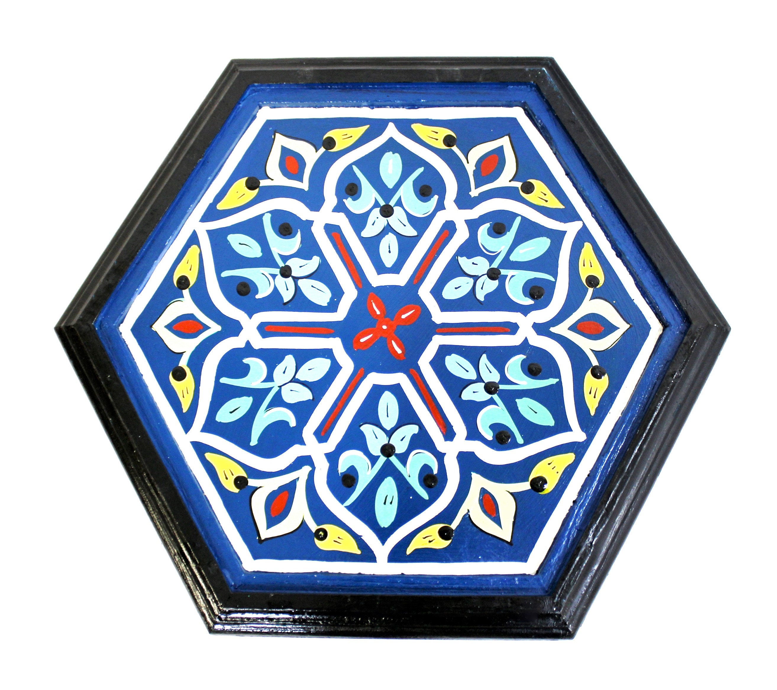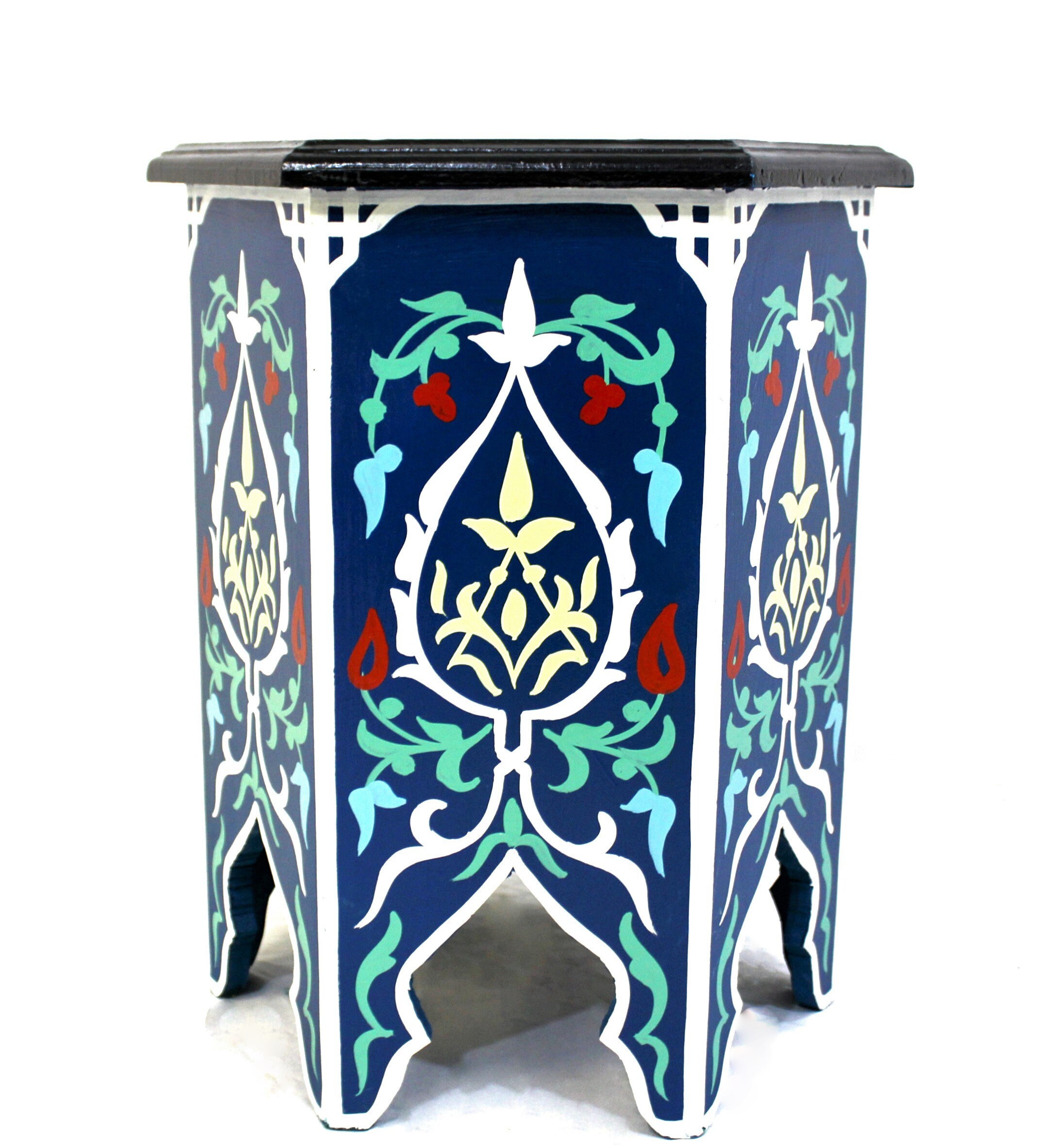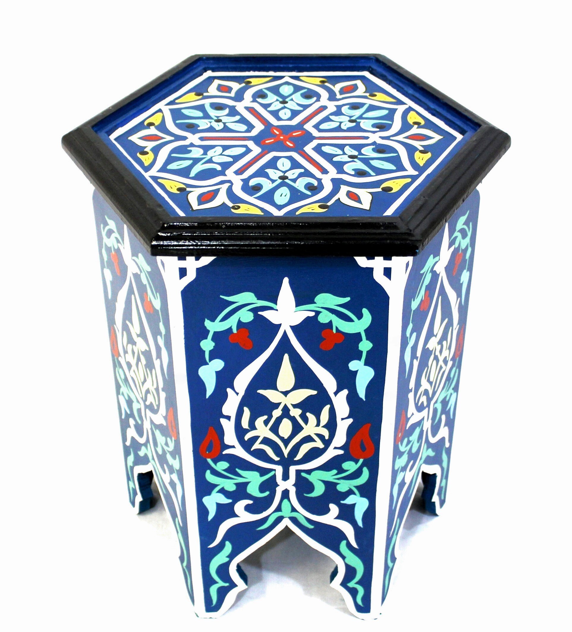 This is a beautiful authentic piece. Hand-crafted in Morocco, using fine quality materials and incredible imagination of artisans. The table is hand-painted. It's made in the shape a hexagon. A perfect side table that will add a special charm to your room.