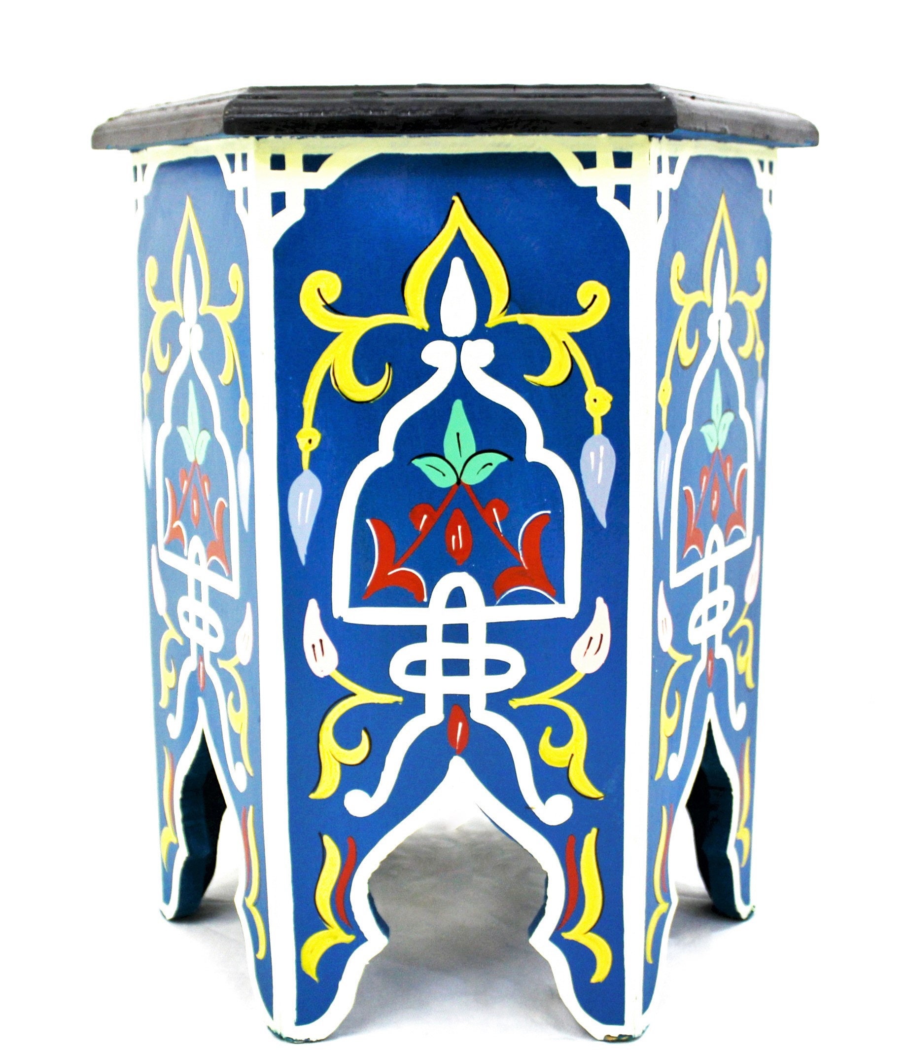 This is a beautiful authentic piece. Hand-crafted in Morocco, using fine quality materials and incredible imagination of artisans. The table is hand-painted. It's made in the shape a hexagon. A perfect side table that will add a special charm to your room.