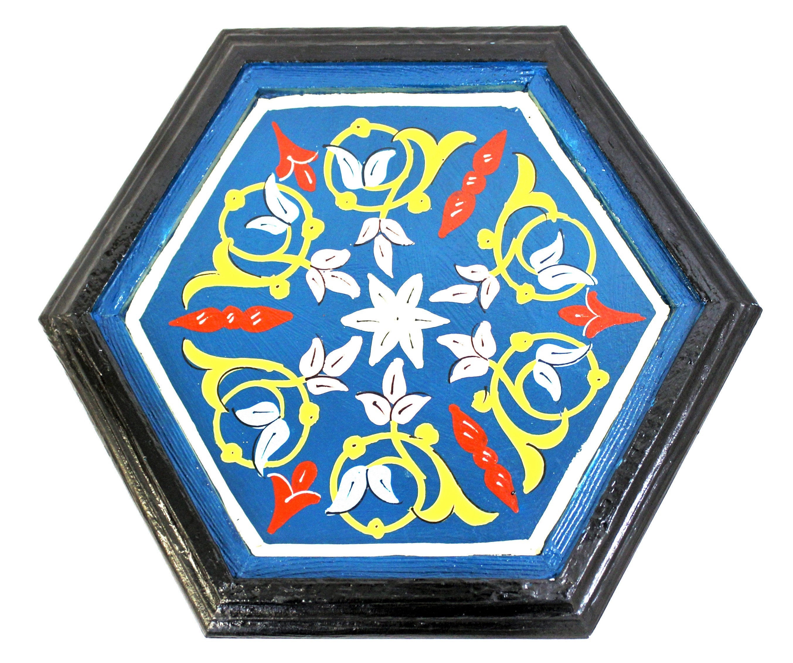 This is a beautiful authentic piece. Hand-crafted in Morocco, using fine quality materials and incredible imagination of artisans. The table is hand-painted. It's made in the shape a hexagon. A perfect side table that will add a special charm to your room.