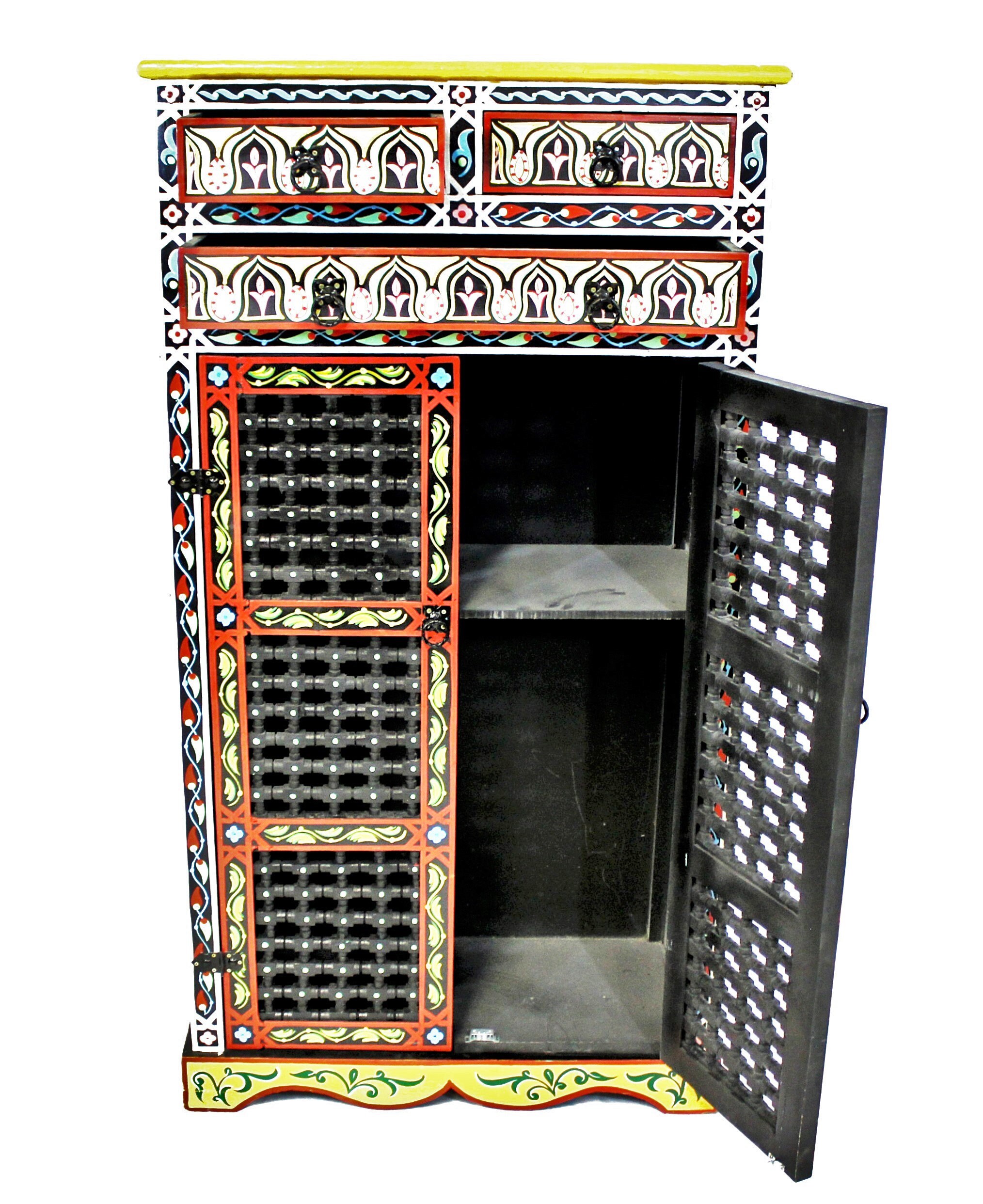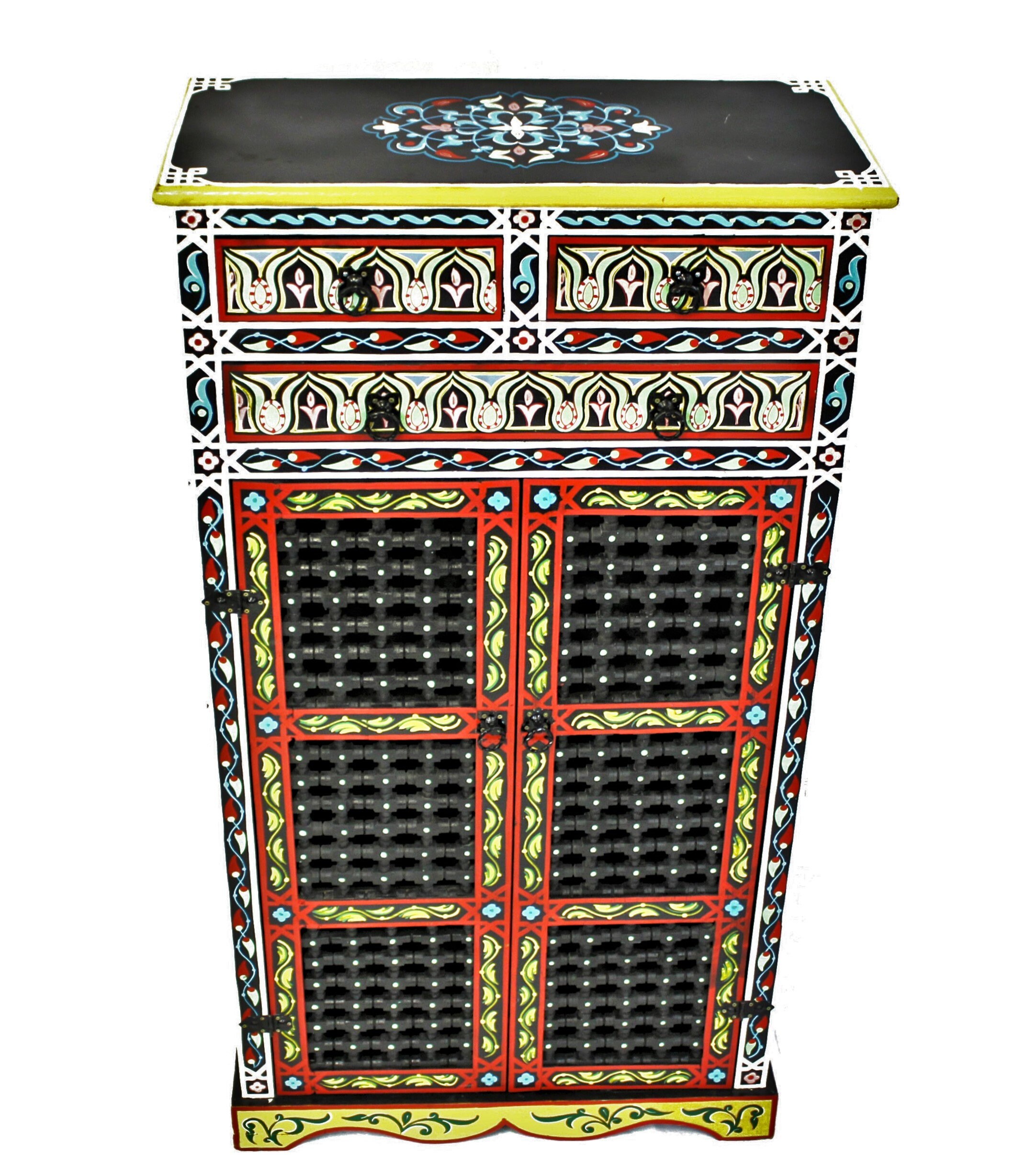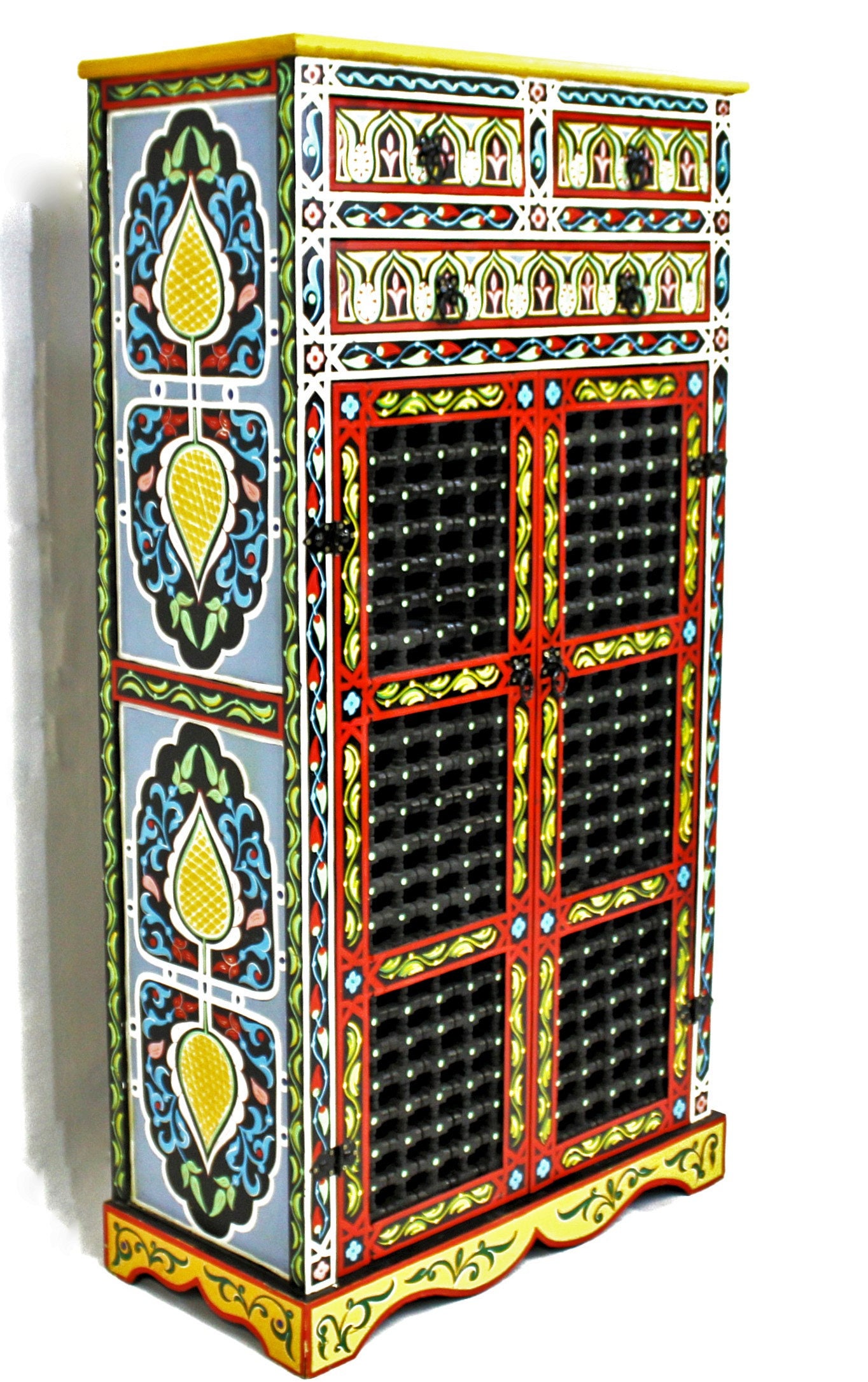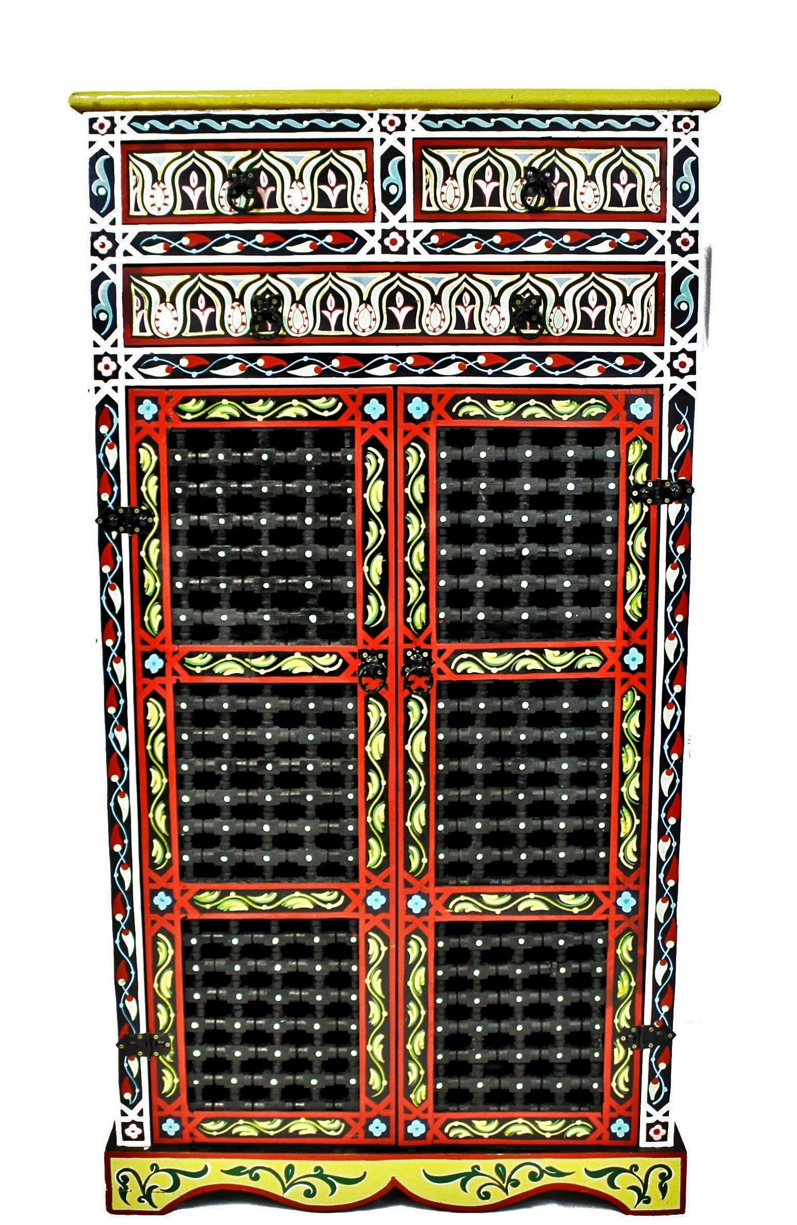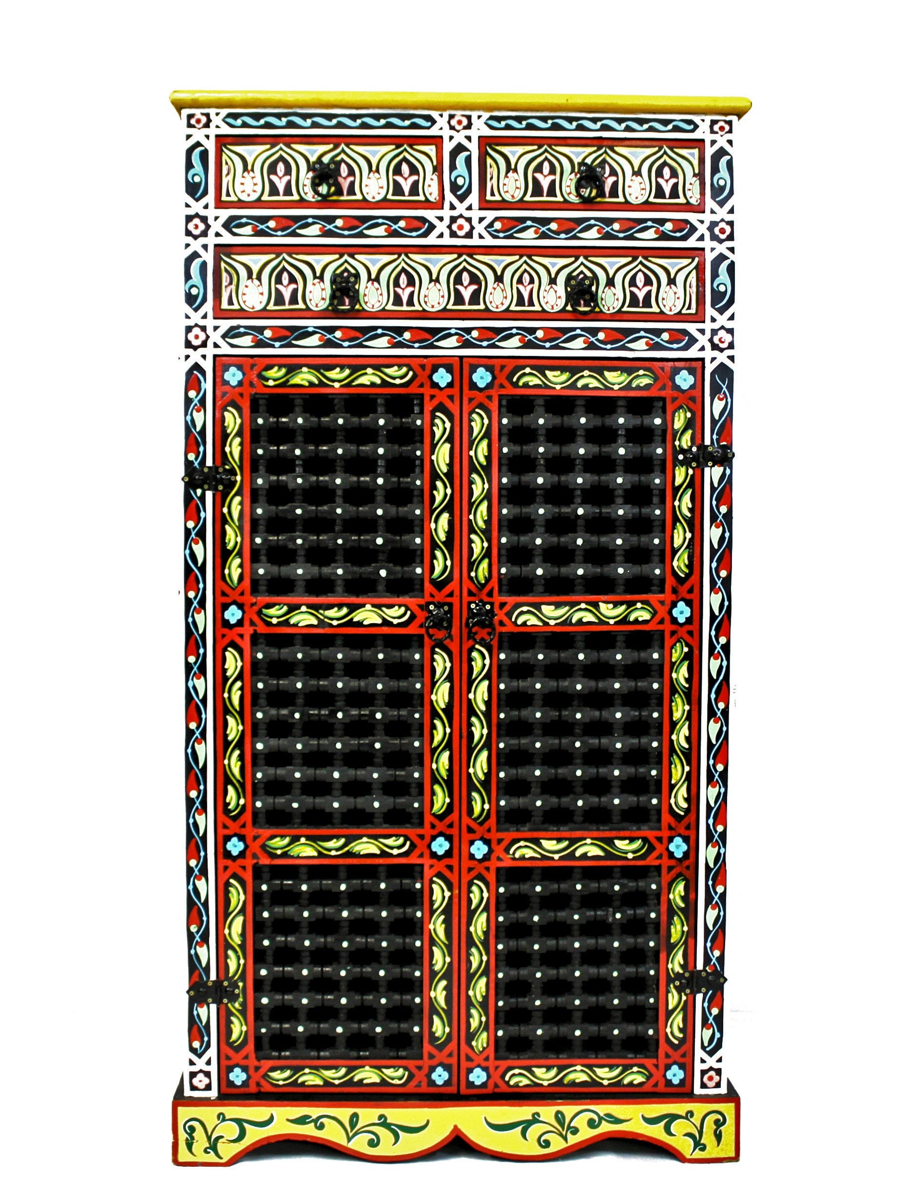 This elegant Moroccan cabinet is hand-painted using traditional tools and techniques by ace artisans from Marrakech. The vibrant colors will add glory and charm to any room, and what most important, will put a warm smile on your face.