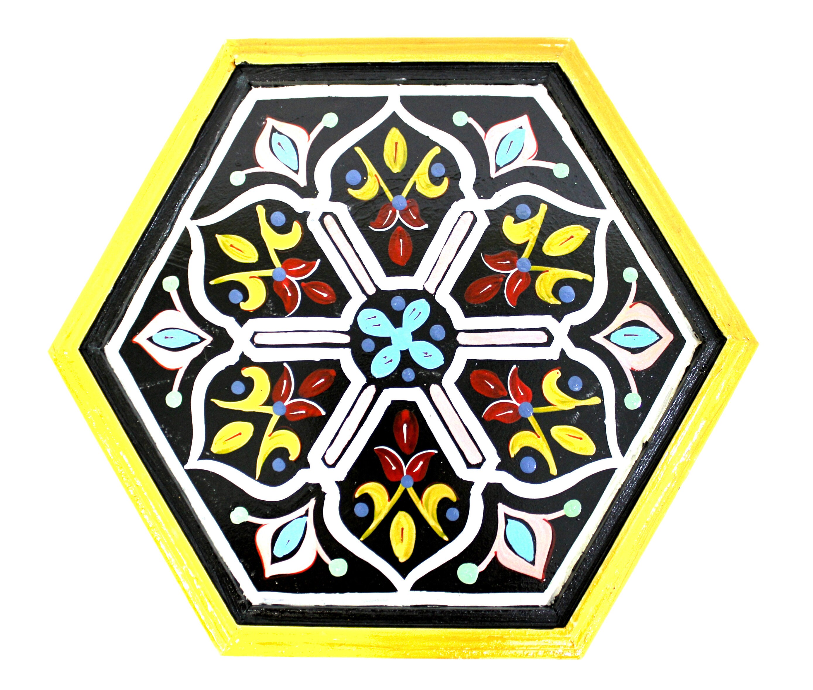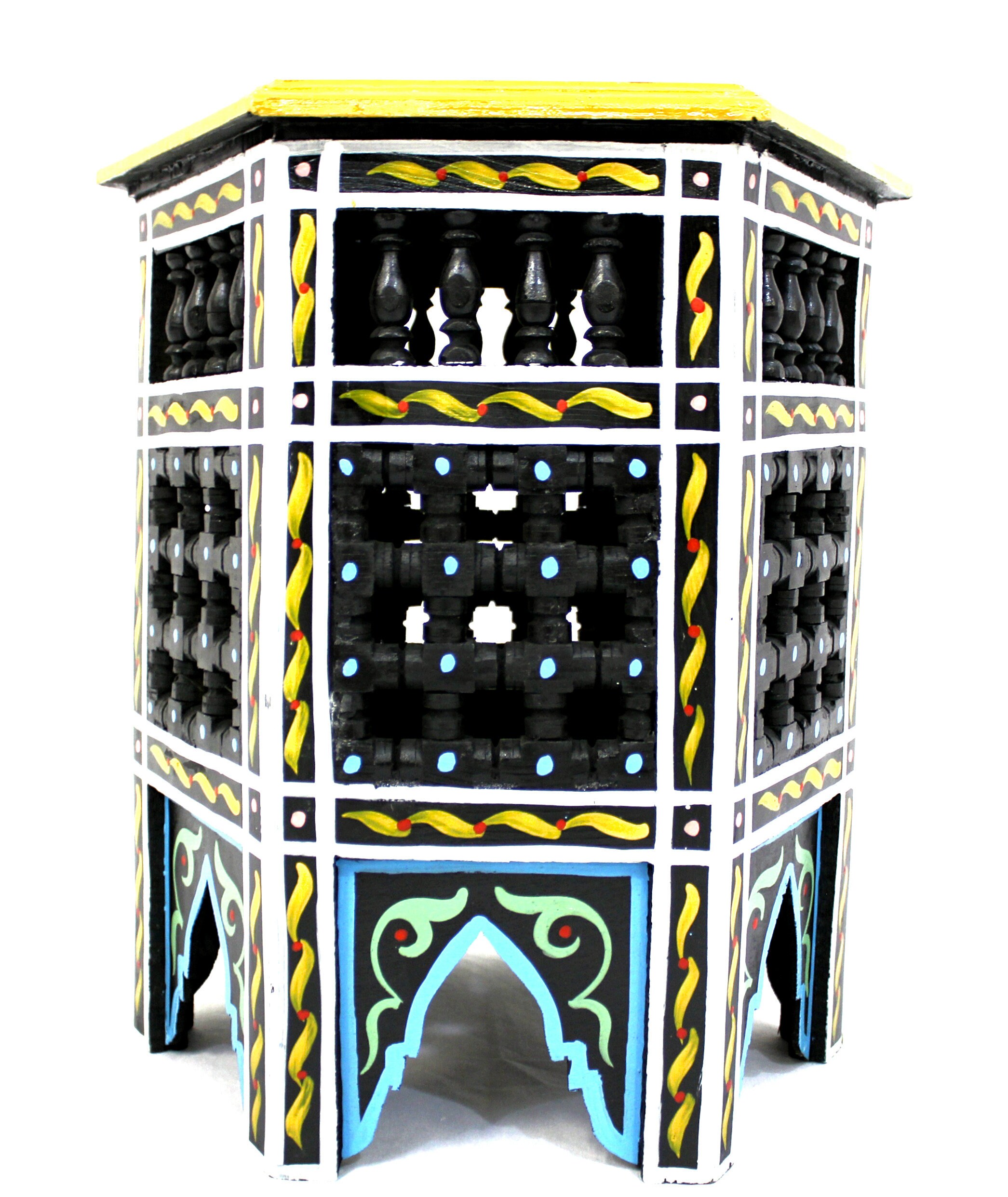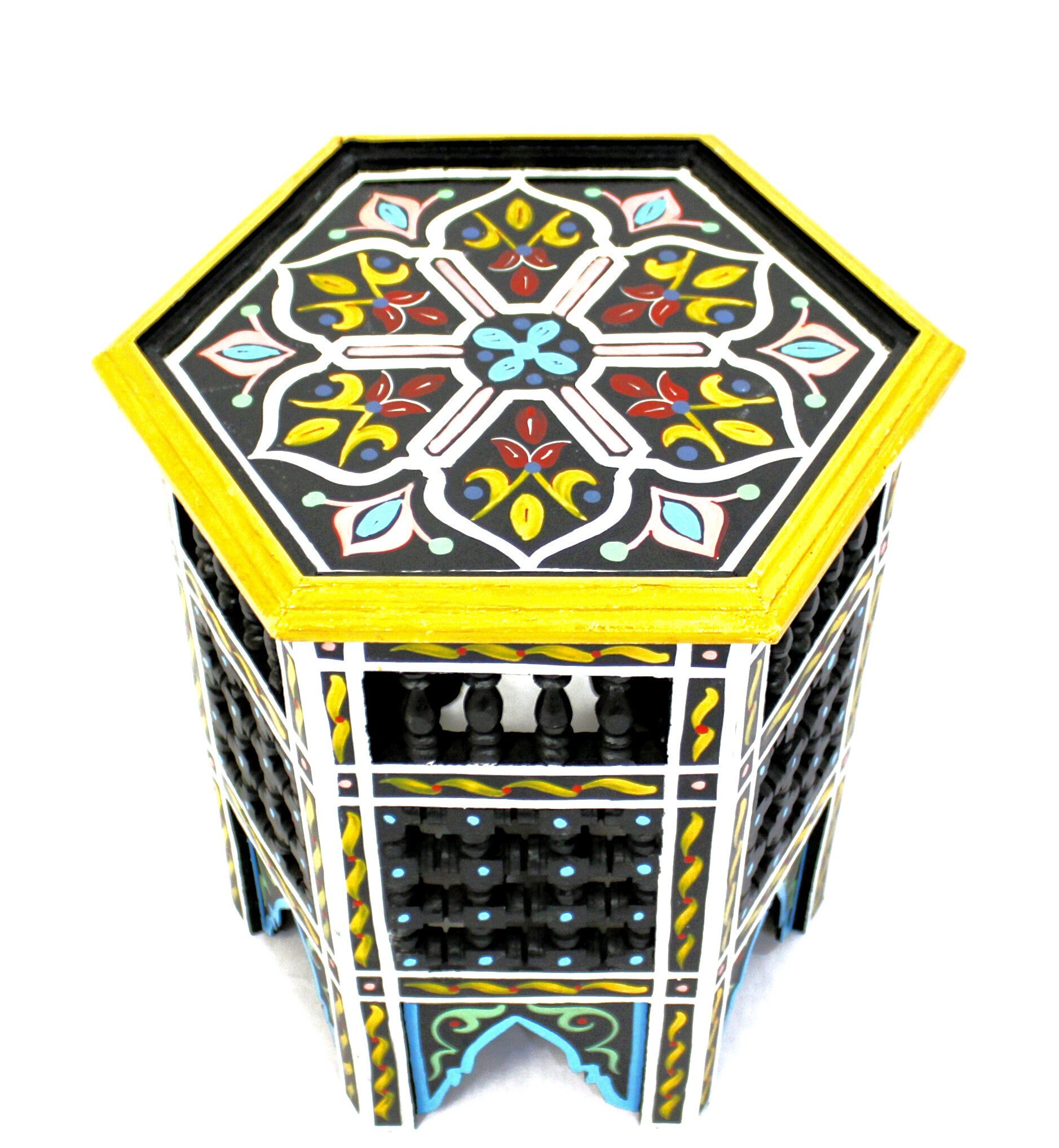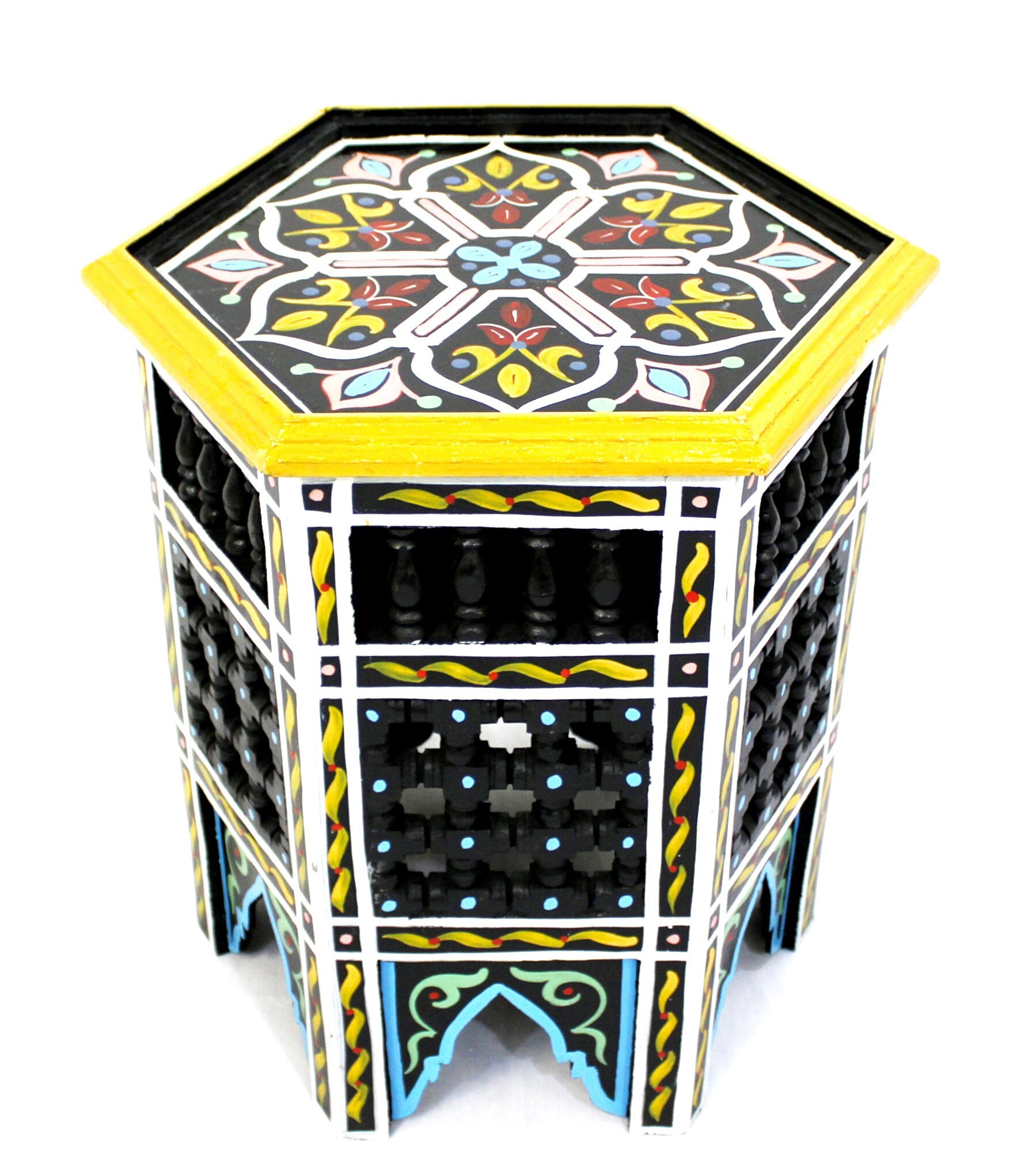This is a beautiful authentic piece. Hand-crafted in Morocco, using fine quality materials and incredible imagination of artisans. The table is hand-painted. It's made in the shape a hexagon. A perfect side table that will add a special charm to your room and put a warm smile on your face.